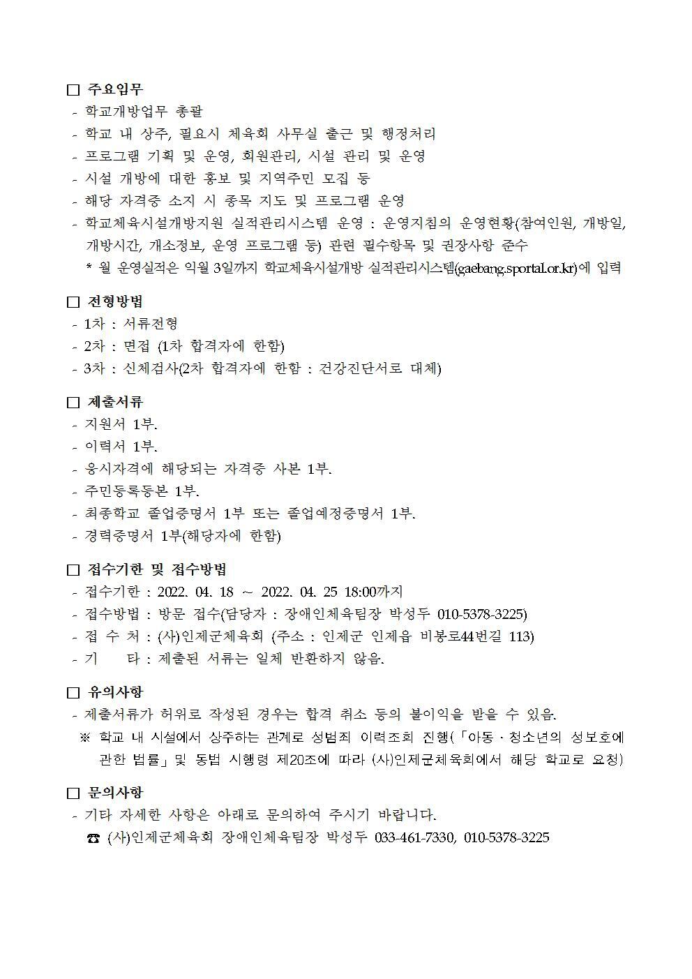 2022 학교체육시설개방사업 관리매니저 채용 재공고 작성자박성두|작성시간22.04.18|조회수187 목록 댓글 0 글자크기 작게가 글자크기 크게가 지원서 양식.hwp56.00KB 첨부파일첨부된 파일이 3개 있습니다. jpg 파일 C:\Users\SAMSUNG\Desktop\장애인체육팀\학교체육시설개방지원사업\관리매니저 채용\2022년 학교체육시설개방지원사업 관리매니저 채용공고(재공고)001.jpg 다운로드 jpg 파일 C:\Users\SAMSUNG\Desktop\장애인체육팀\학교체육시설개방지원사업\관리매니저 채용\2022년 학교체육시설개방지원사업 관리매니저 채용공고(재공고)002.jpg 다운로드 hwp 파일 C:\Users\SAMSUNG\Desktop\장애인체육팀\학교체육시설개방지원사업\관리매니저 채용\지원서 양식.hwp 다운로드 다음검색 현재 게시글 추가 기능 열기 북마크 공유하기 신고 센터로 신고 댓글 댓글 0 댓글쓰기 답글쓰기 댓글 리스트