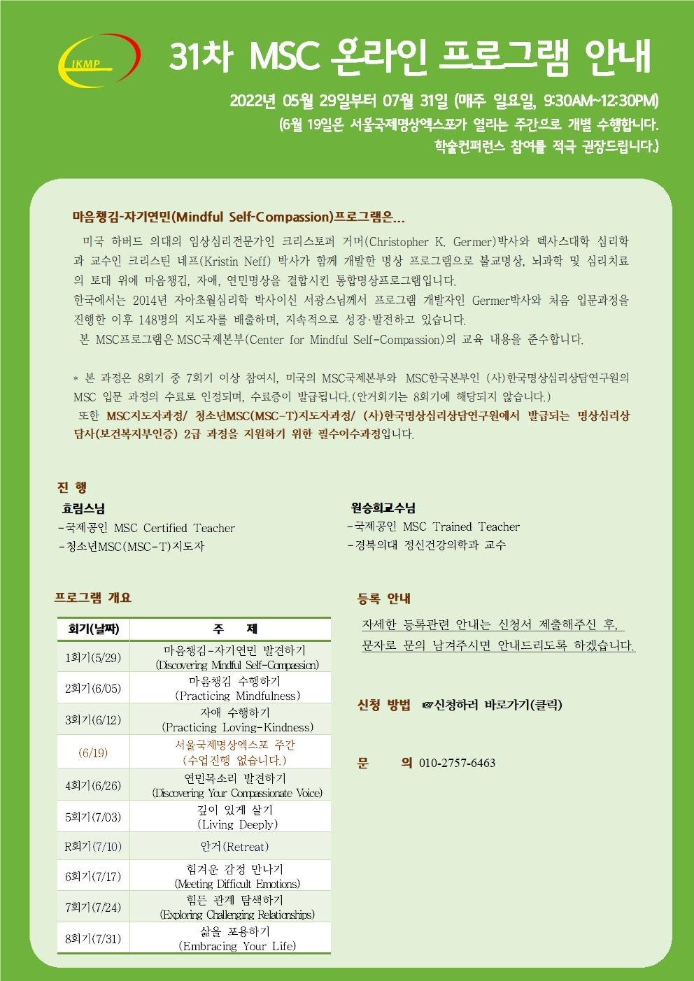 (31차) MSC 온라인프로그램안내 (5/29~7/31, 매주 일요일 9:30AM~12:30PM)zoom-조기성원마감