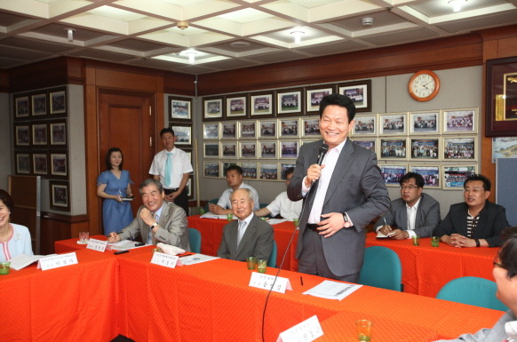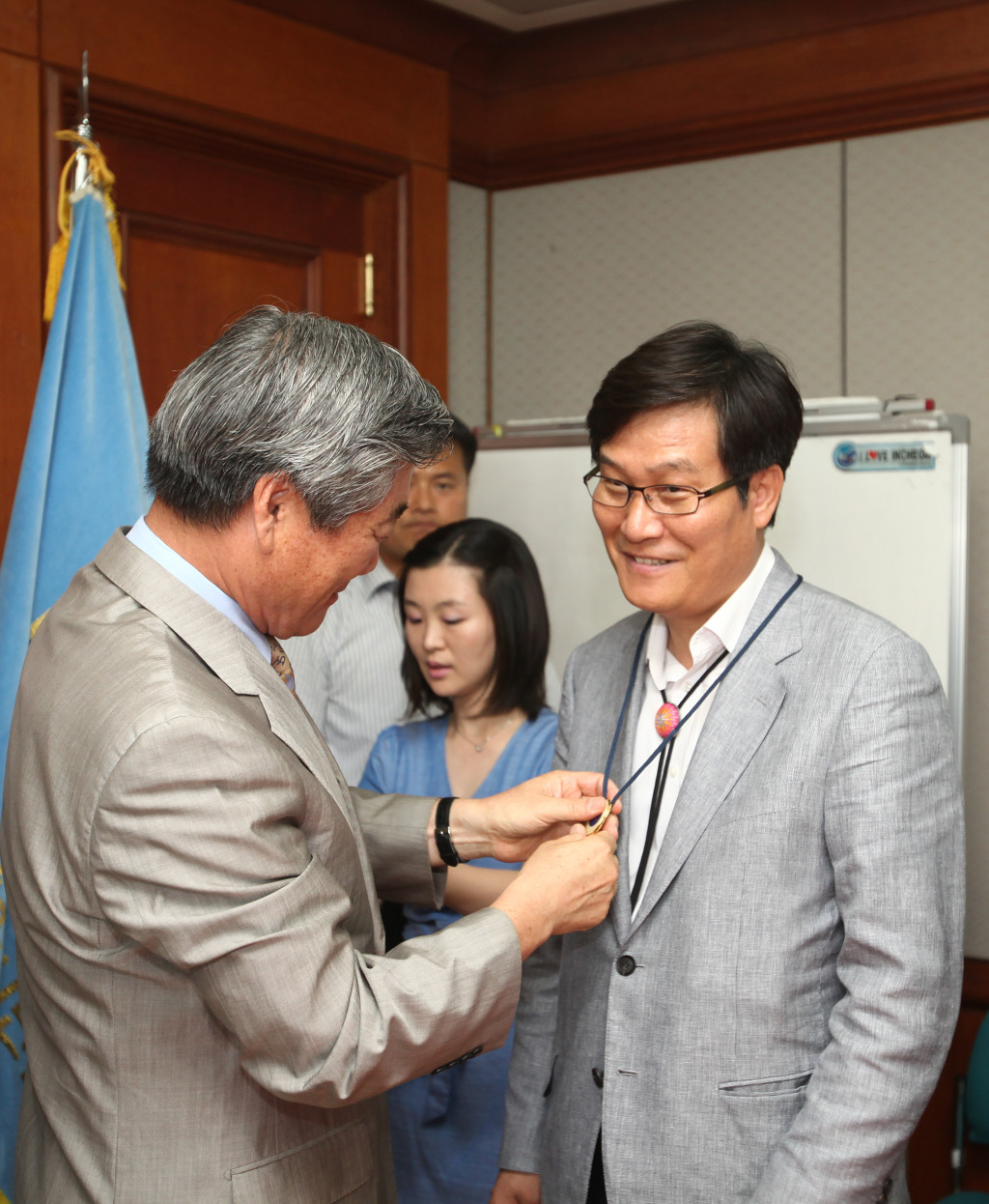 정명환회장님께서 신동근정무부시장님께 링타이를 걸어드리고...