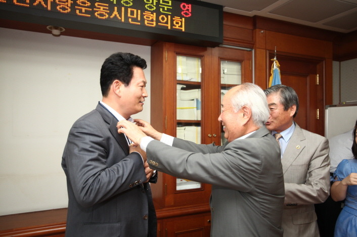 이성구초대상임대표께서 송영길시장님께 링타이를 걸어드리고...