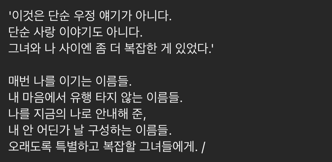 즉 이 양가적 감정은 H가 S에 대해 가지게 되는 마음이며, 우정도 사랑도 아닌 그 무언가. S처럼 되고싶은 동경과 함께 동반되는 S에 대한 막연한 질투심. S가 툭 시시하게 때로는 아주 비범하게 보여준 이야기 한 조각으로부터 오는 S를 향한 열렬한 사랑과 이를 자신 안에 가둬두고싶을만큼 커다란 H의 소유욕이 표현된 부분이라고 생각해본다.