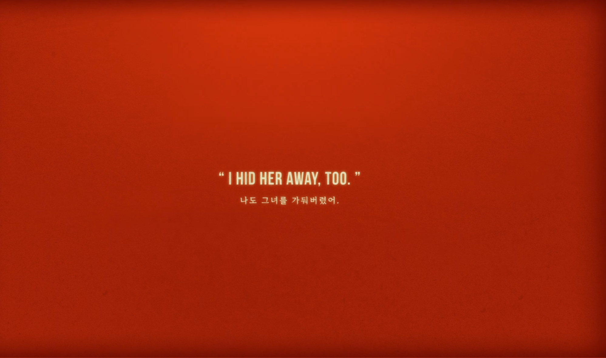 H는 속삭임을 듣고 이내 H와 S의 시선은 H의 집 바닥에 있는 작은 문으로 향한다. 그 문에는 붉은 옷자락이 끼여있다.