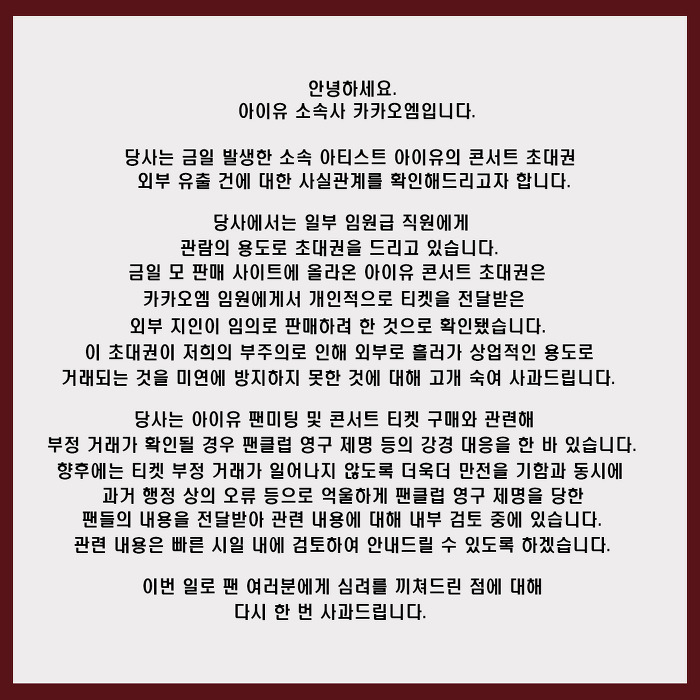 [[공지]]안녕하세요. 카카오엠입니다. 작성자IU official staff|작성시간19.11.14|조회수24,199 목록 댓글 0 글자크기 작게가 글자크기 크게가 다음검색 현재 게시글 추가 기능 열기 북마크 공유하기 신고 센터로 신고 댓글 댓글 0 댓글쓰기 답글쓰기 댓글 리스트