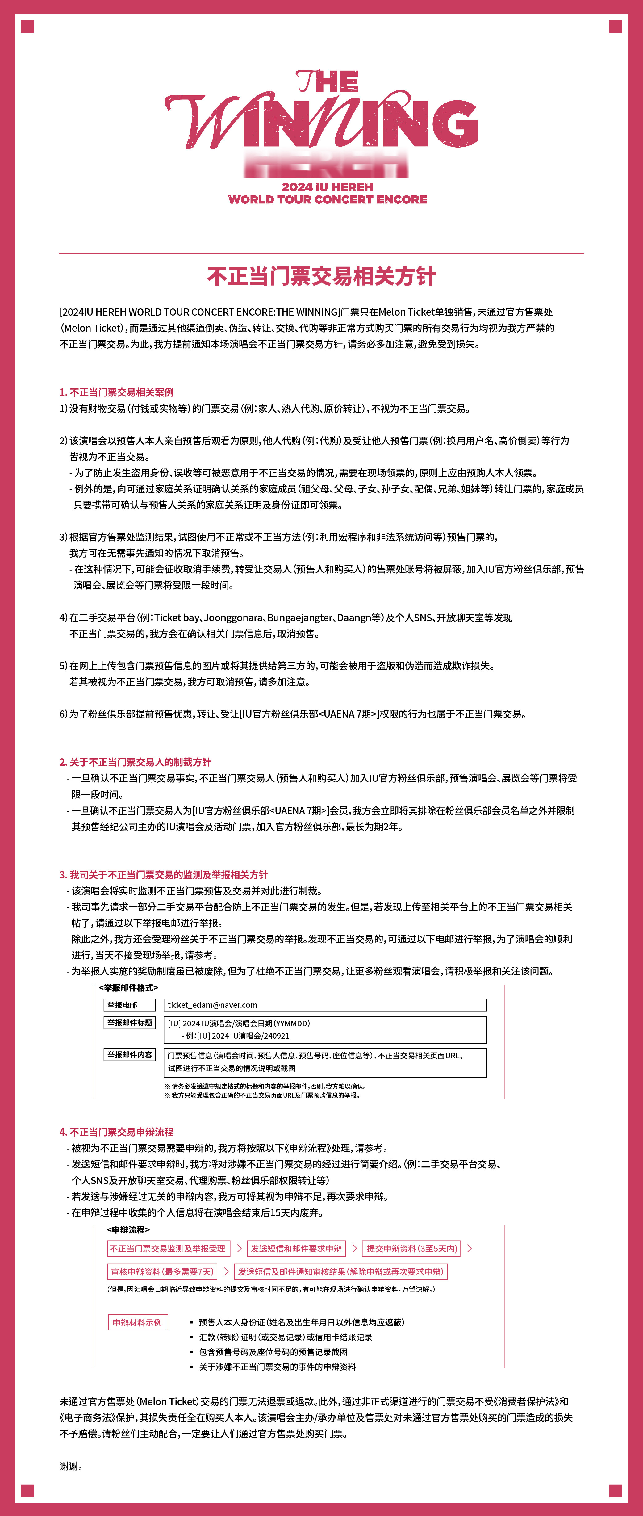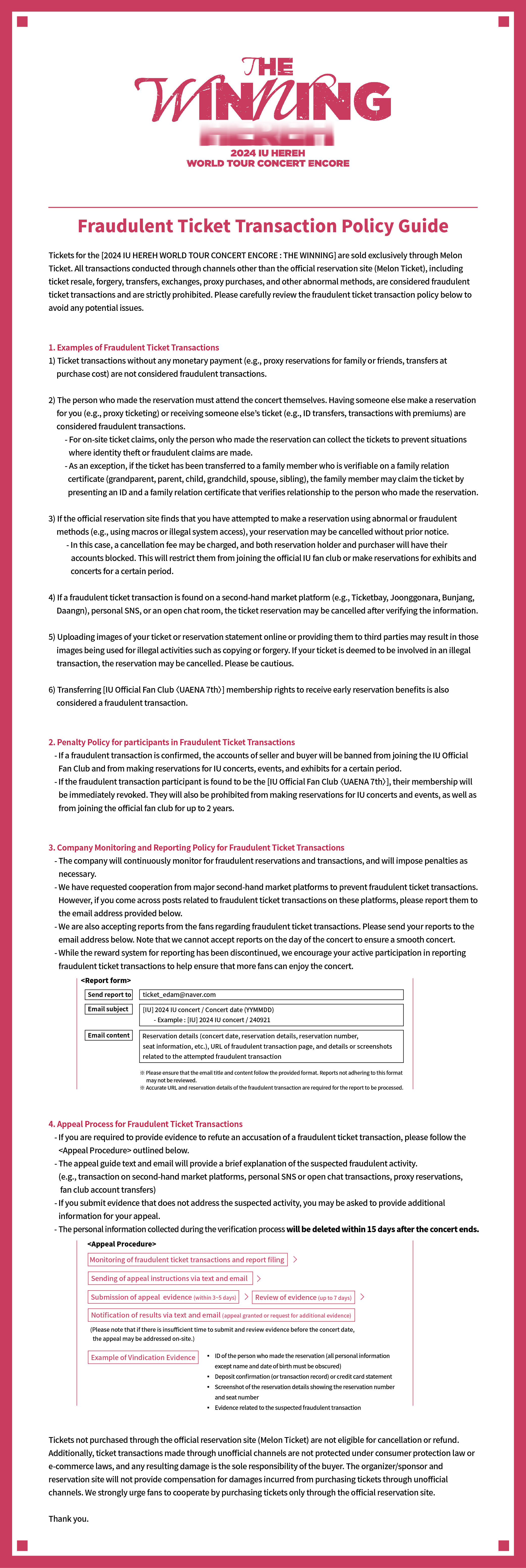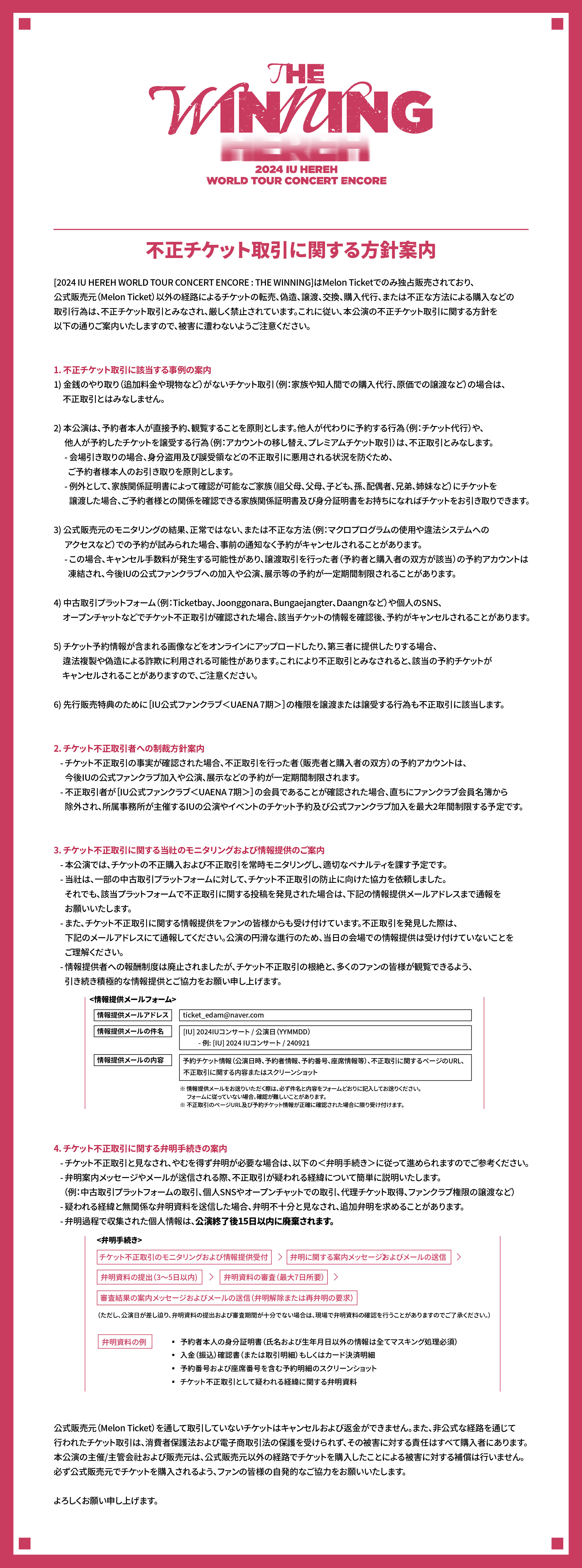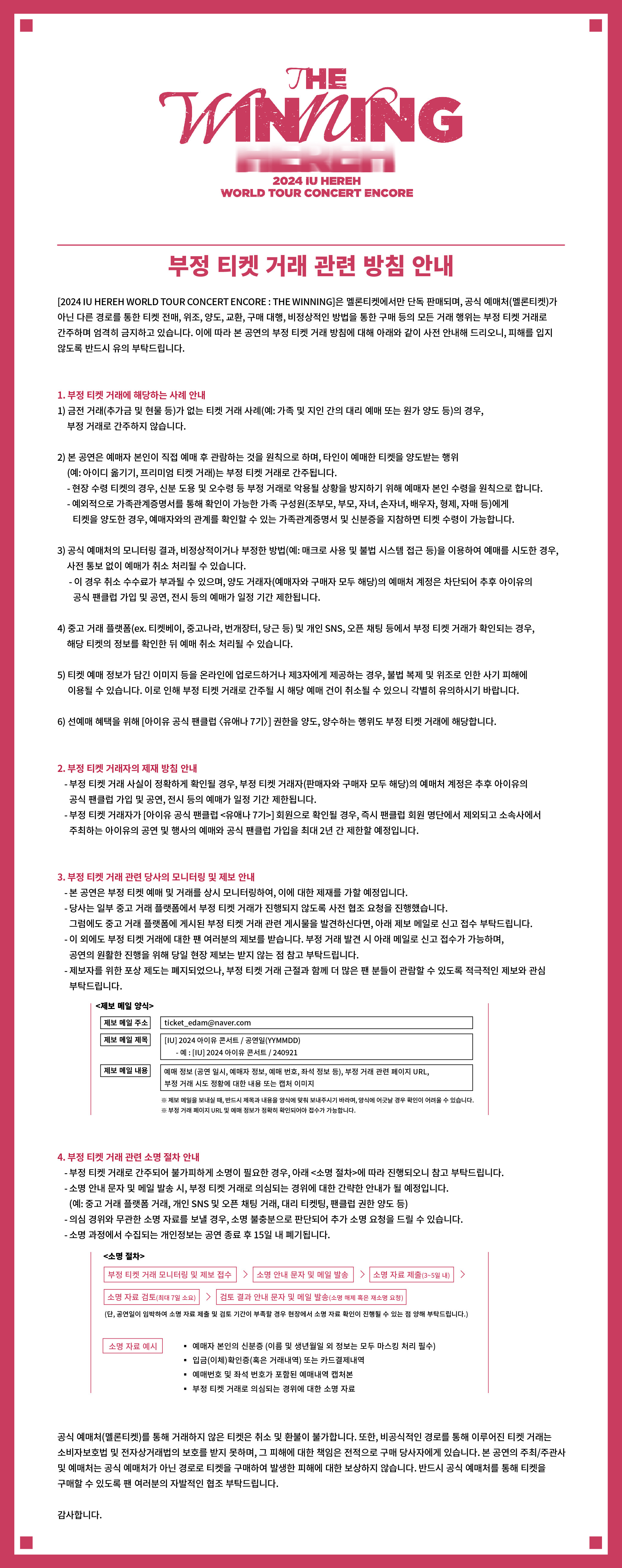 2024 IU HEREH WORLD TOUR CONCERT ENCORE : THE WINNING 부정 티켓 거래 관련 방침 안내드립니다.