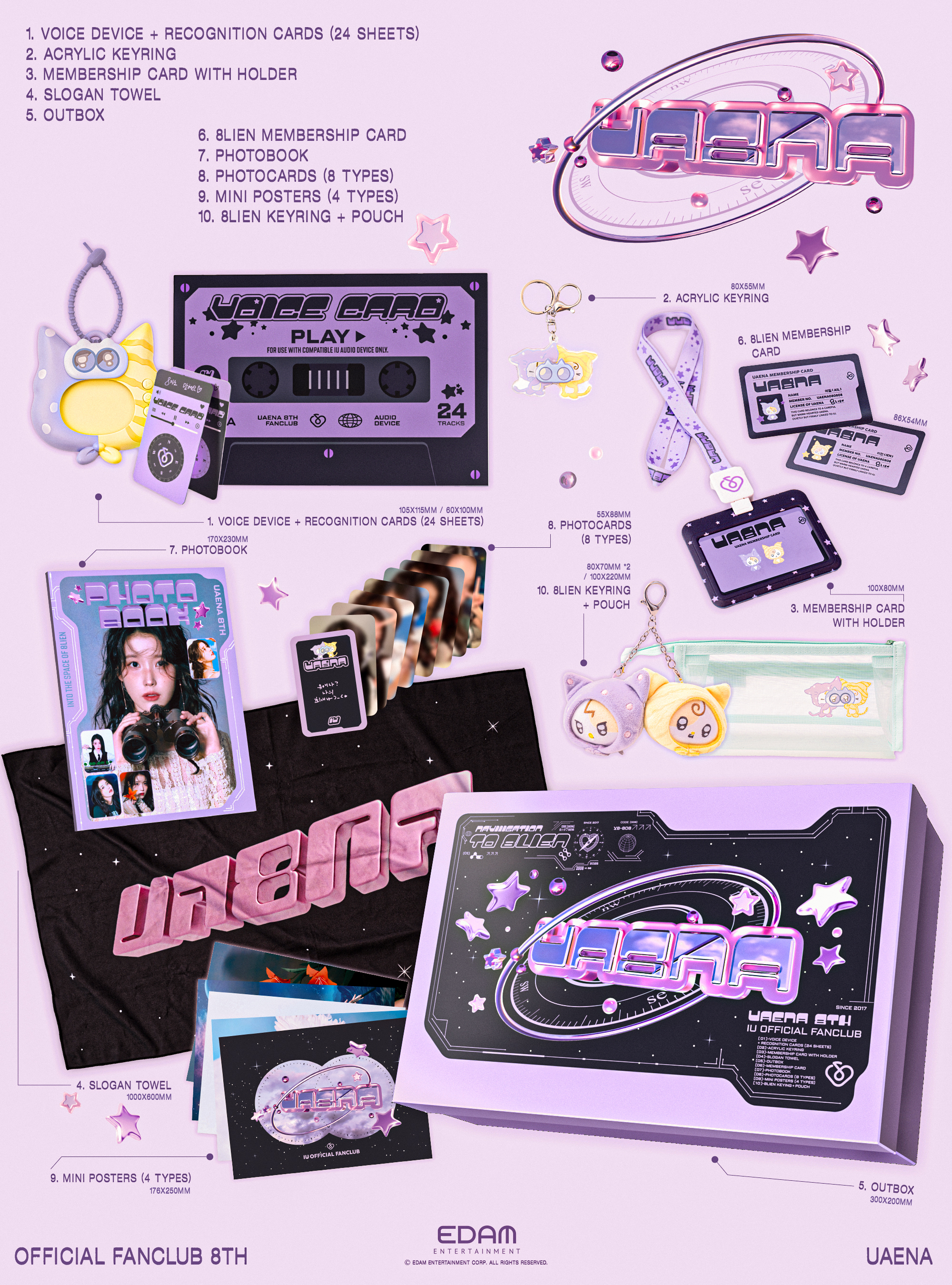 We hereby announce the detailed items included in the IU Official Fan Club <UAENA> 8th OFFICIAL FANCLUB KIT. Please refer to the list below.