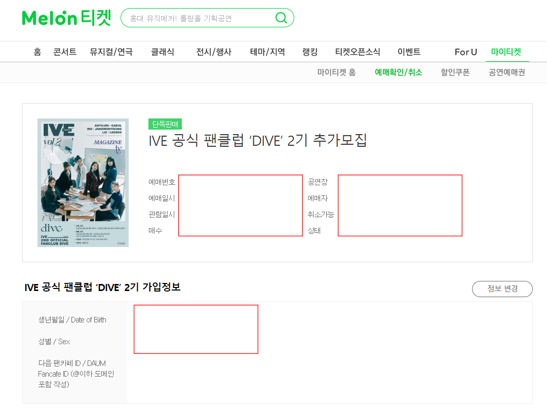 : 멜론티켓 어플 접속 – 예매 확인 – IVE 공식 팬클럽 ‘DIVE’ 2기 (최초, 추가 가입 무관)