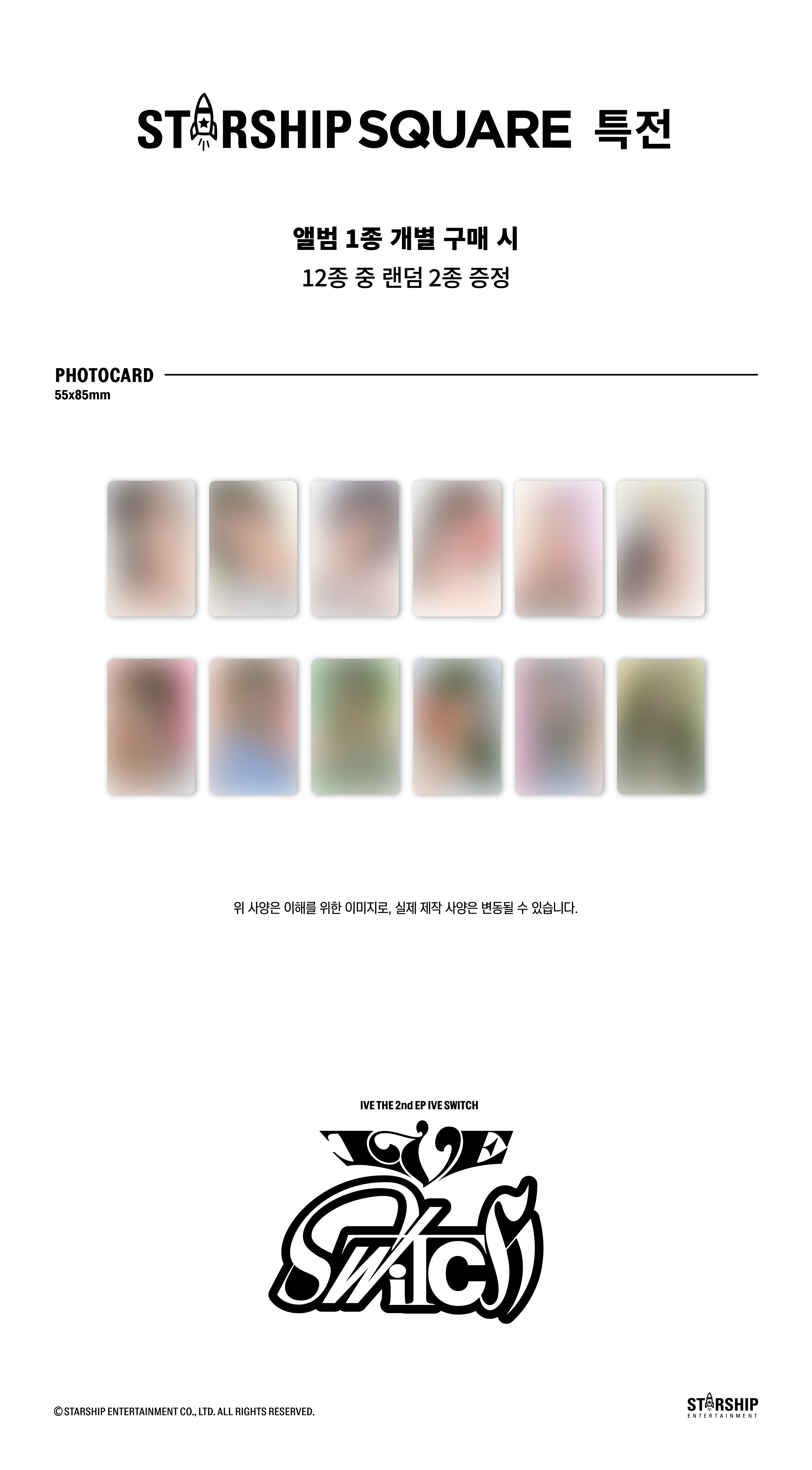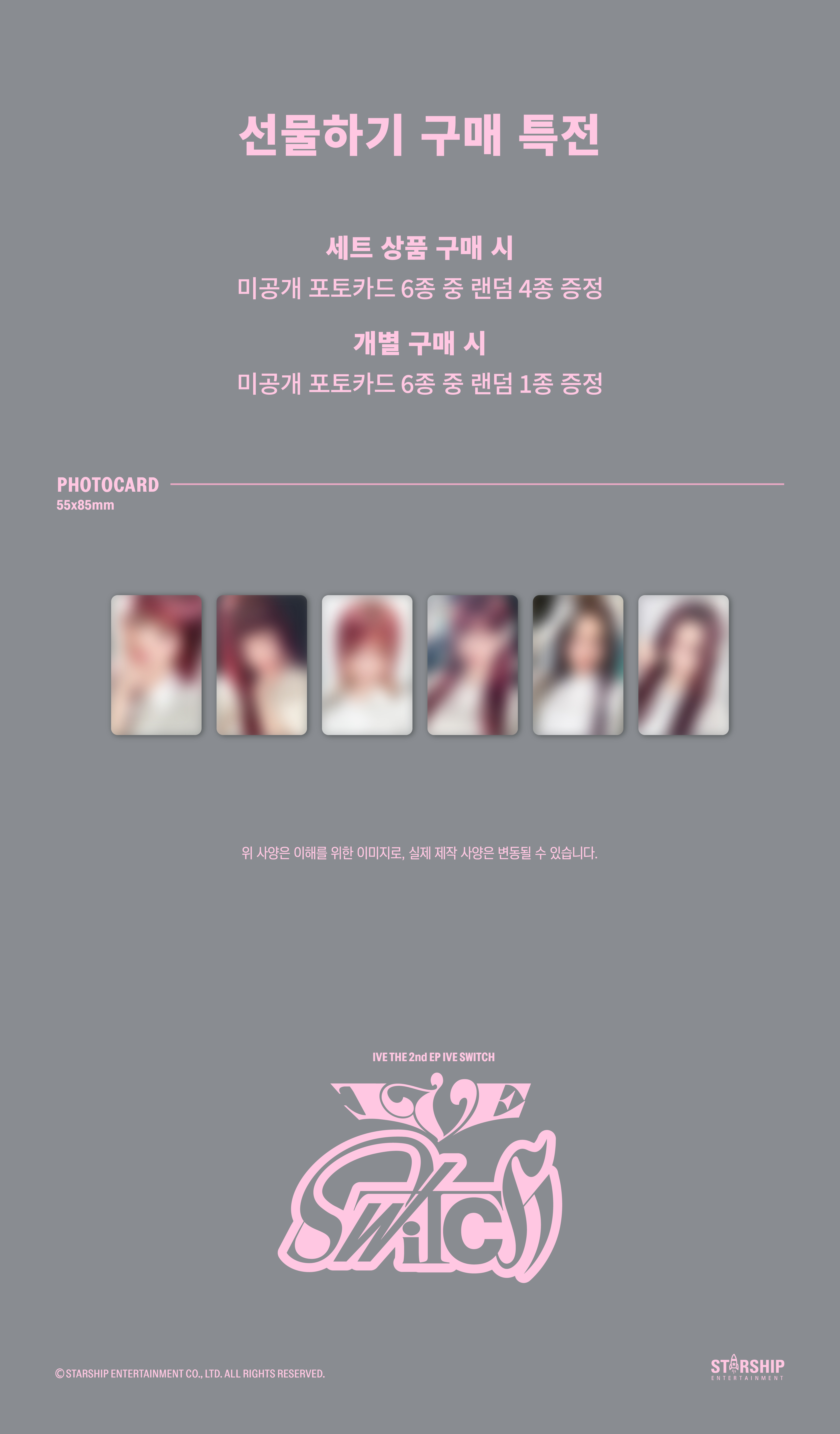 - 기본 앨범 ( ON, OFF, SPIN-OFF ver. ) 3종 + LOVED IVE ver. 4종 세트 구매 시 : 포토카드 6종 중 랜덤 4종 증정