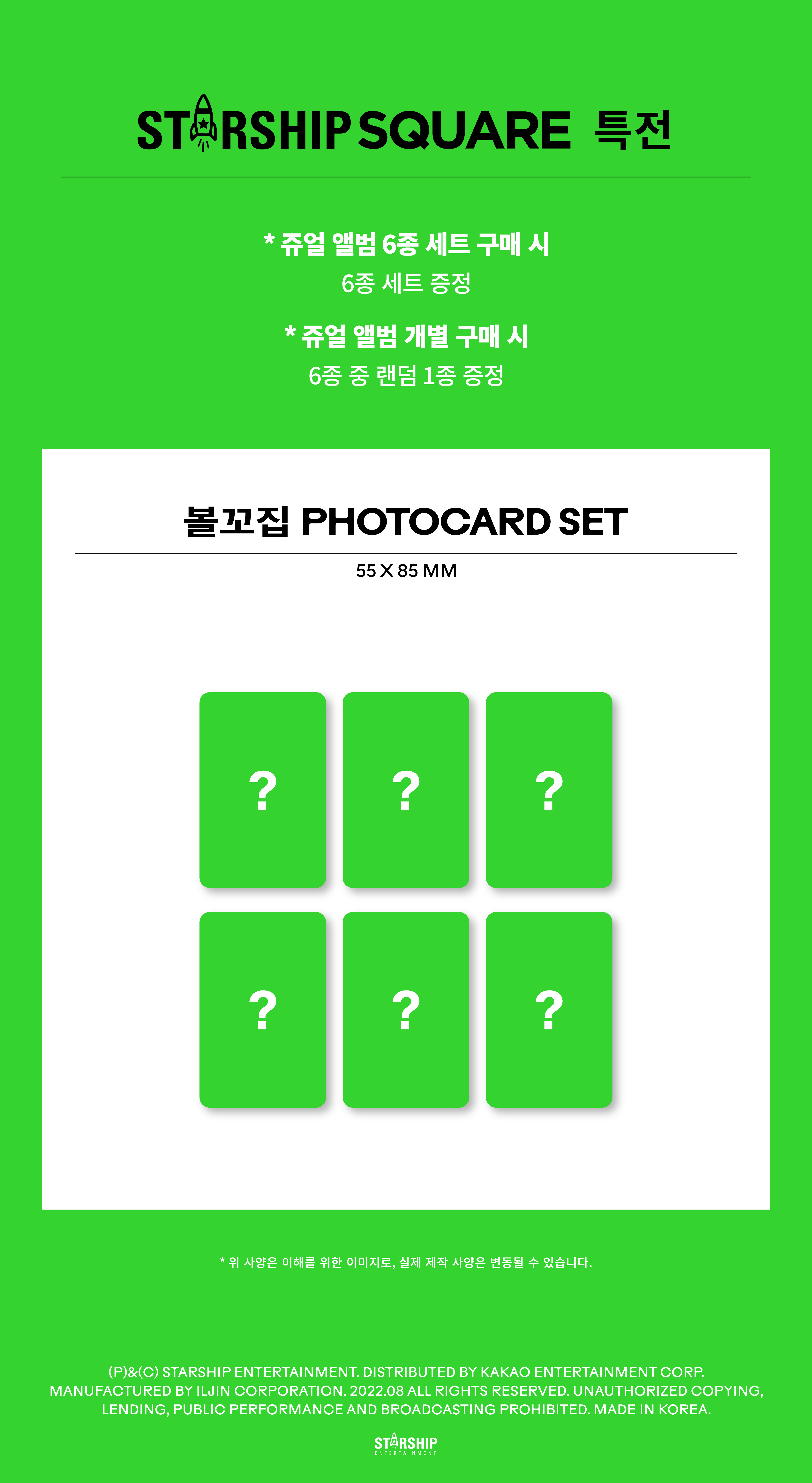 - 쥬얼 앨범 1종 개별 구매 시 : 볼꼬집 PHOTOCARD SET 6종 중 랜덤 1종 증정