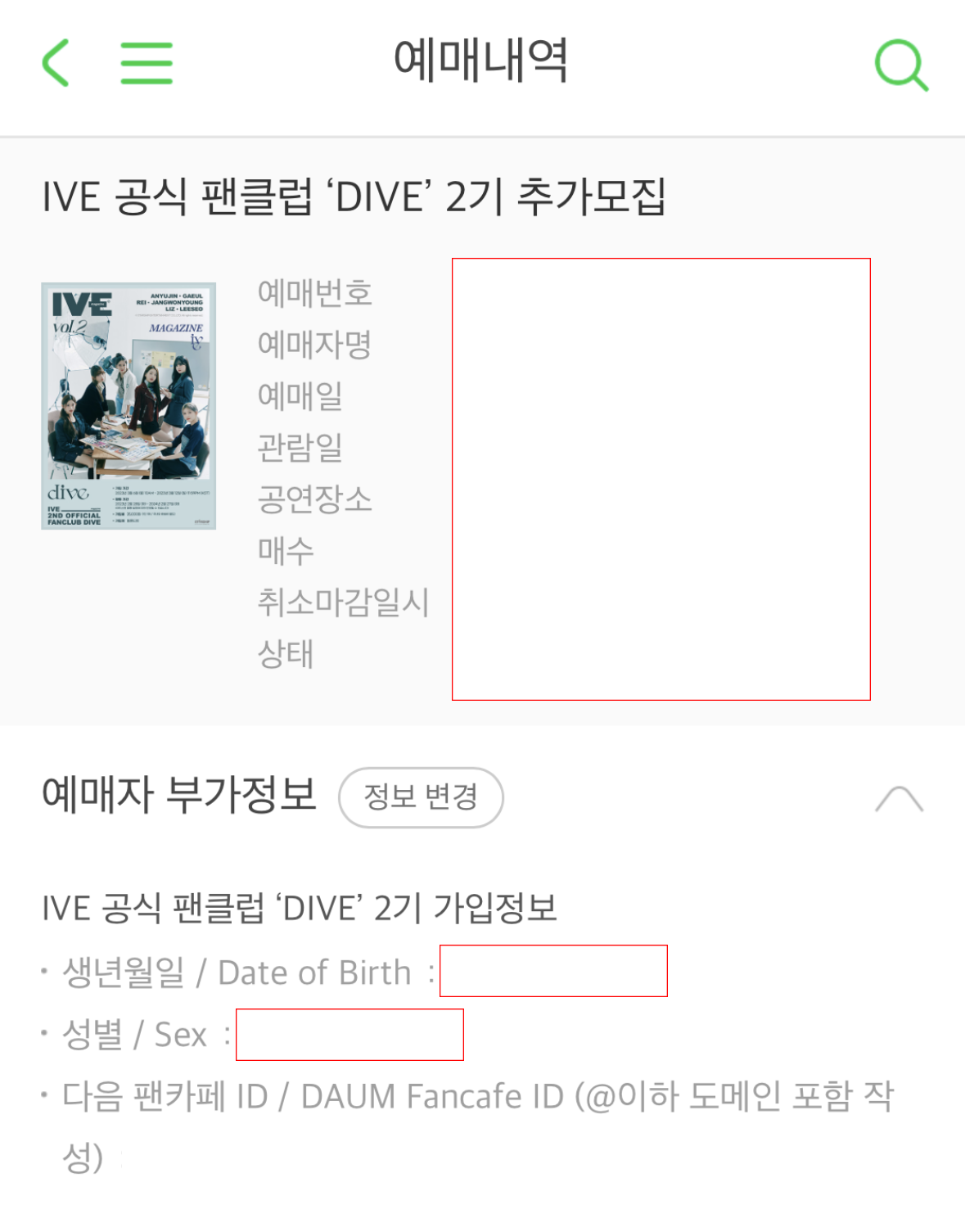 : 멜론티켓 어플 접속 – 예매 확인 – IVE 공식 팬클럽 ‘DIVE’ 2기 (최초, 추가 가입 무관)