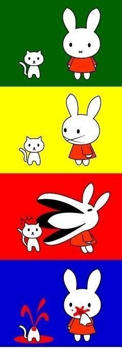 샤오랑은 청명이를 좋아했다. 샤오랑이 그래서 도진이를 못잡아서 안달 지수의엄마는 체리의 엄마를 사랑했다. 지수엄마 - 내가 소하를 얼마나 좋아했는데. 소하는...선생님하고 결혼해서 행복해했어요. 여태 본 중에서 가장 아름답게 늘 웃곤 했죠. 체리아빠 = 에리얼 = 크로우리드는 동일인물이다. 2.미피 미피는 왕따문제로 생겨난 캐릭터 미피가 X자입을 가진것은 바로 " 넌 말하지말고 내말만들어 " 라는뜻 Miffy라는 뜻은 " 입을 닥치다.다물다 " 라는뜻 미피는 식인토끼 그래서 다시는 살인을하지못하게 입을 꿰메어 놓은것 3. 짱구는못말려 짱구,짱아,짱구친구들은 목이없음 어떻게 음식을 넘길수있는걸까? 그러나 부모님,선생님들은 모두 목이있다 짱구는 외계인? 흰눈동자가 안에있고 검정색눈동자가 밖에있음 철수또한 검정색눈동자가 모두 차지함 4.