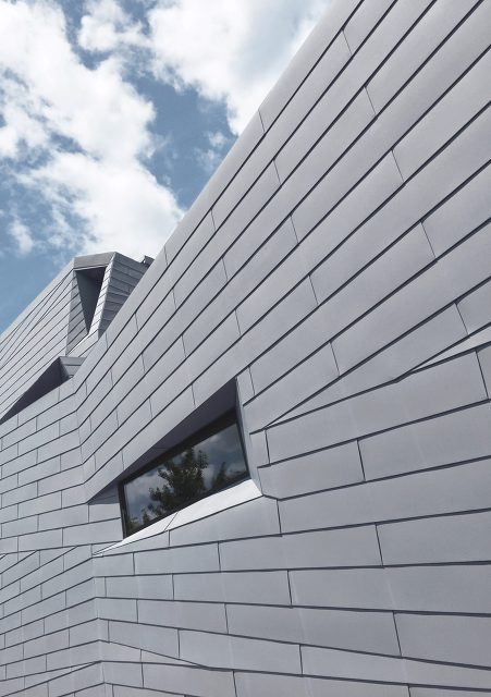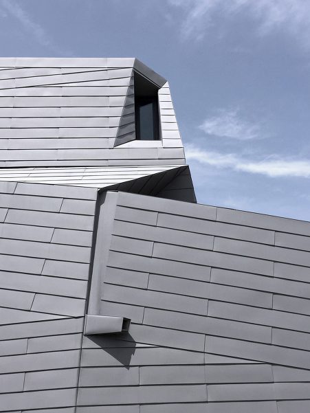기하학적 모양의 독특한 건물은 징크로 뒤덮여 있습니다.