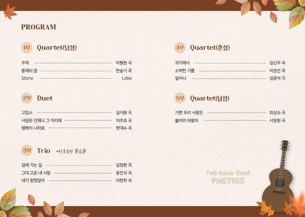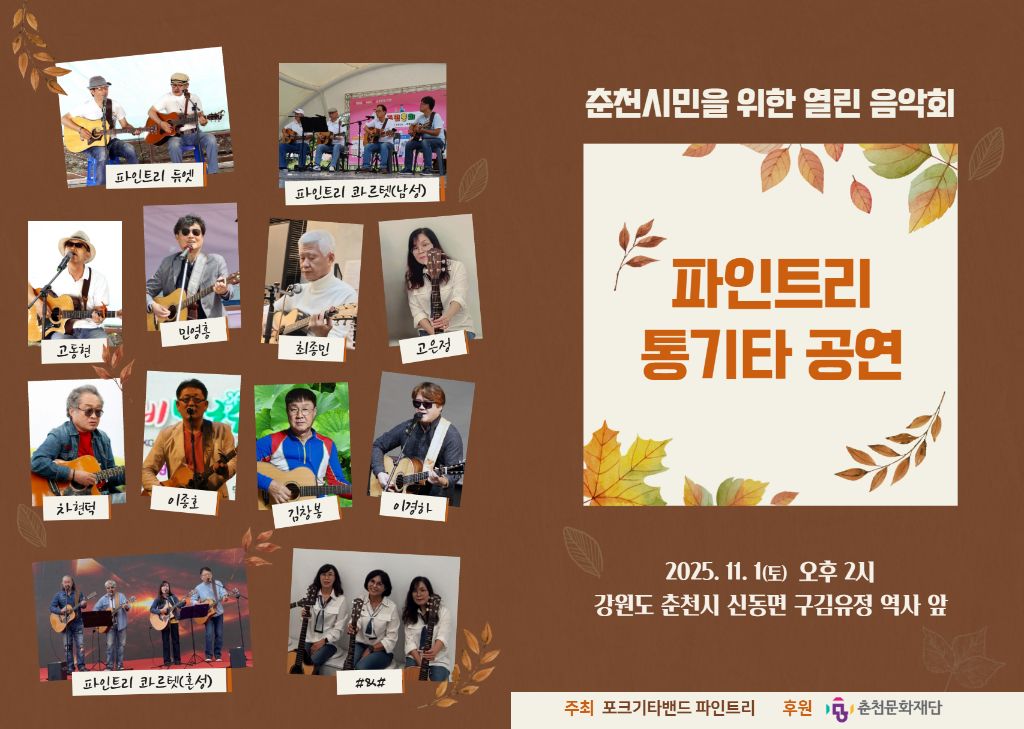 안녕하세요. 파인트리 2차 '열린 음악회 통기타 공연'을 다음과 같이 합니다. 많은 관심과 홍보 부탁 드립니다.