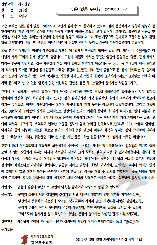 200322 가정예배문 - 그 누운 것을 보시고 (요한복음 5:1~9) 작성자숲속의호수|작성시간20.03.21|조회수56 목록 댓글 0 글자크기 작게가 글자크기 크게가 다음검색 현재 게시글 추가 기능 열기 북마크 공유하기 신고 센터로 신고 댓글 댓글 0 댓글쓰기 답글쓰기 댓글 리스트