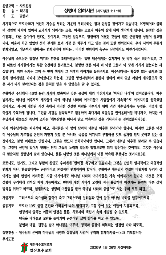 200426 가정예배문 - 성령이 임하시면 (사도행전 1:1~8) 작성자숲속의호수|작성시간20.04.25|조회수76 목록 댓글 0 글자크기 작게가 글자크기 크게가 200426가정예배문.hwp 첨부파일첨부된 파일이 2개 있습니다. etc 파일 200426가정예배문.PNG 다운로드 hwp 파일 200426가정예배문.hwp 다운로드 다음검색 현재 게시글 추가 기능 열기 북마크 공유하기 신고 센터로 신고 댓글 댓글 0 댓글쓰기 답글쓰기 댓글 리스트