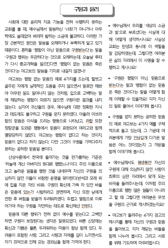 ① 사람들이 가지고 있는 어떤 형태의 믿음은 구원에 이르지 못하는 믿음이다. 믿는다는 고백의 말만 하면 구원을 받은 것이라는 생각에 대해 심각하게 반성해야 한다.