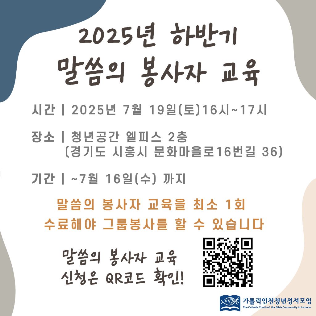 2025년 하반기 말씀의 봉사자 교육이 7월 19일 토요일에 청년공간 엘피스에서 있습니다.