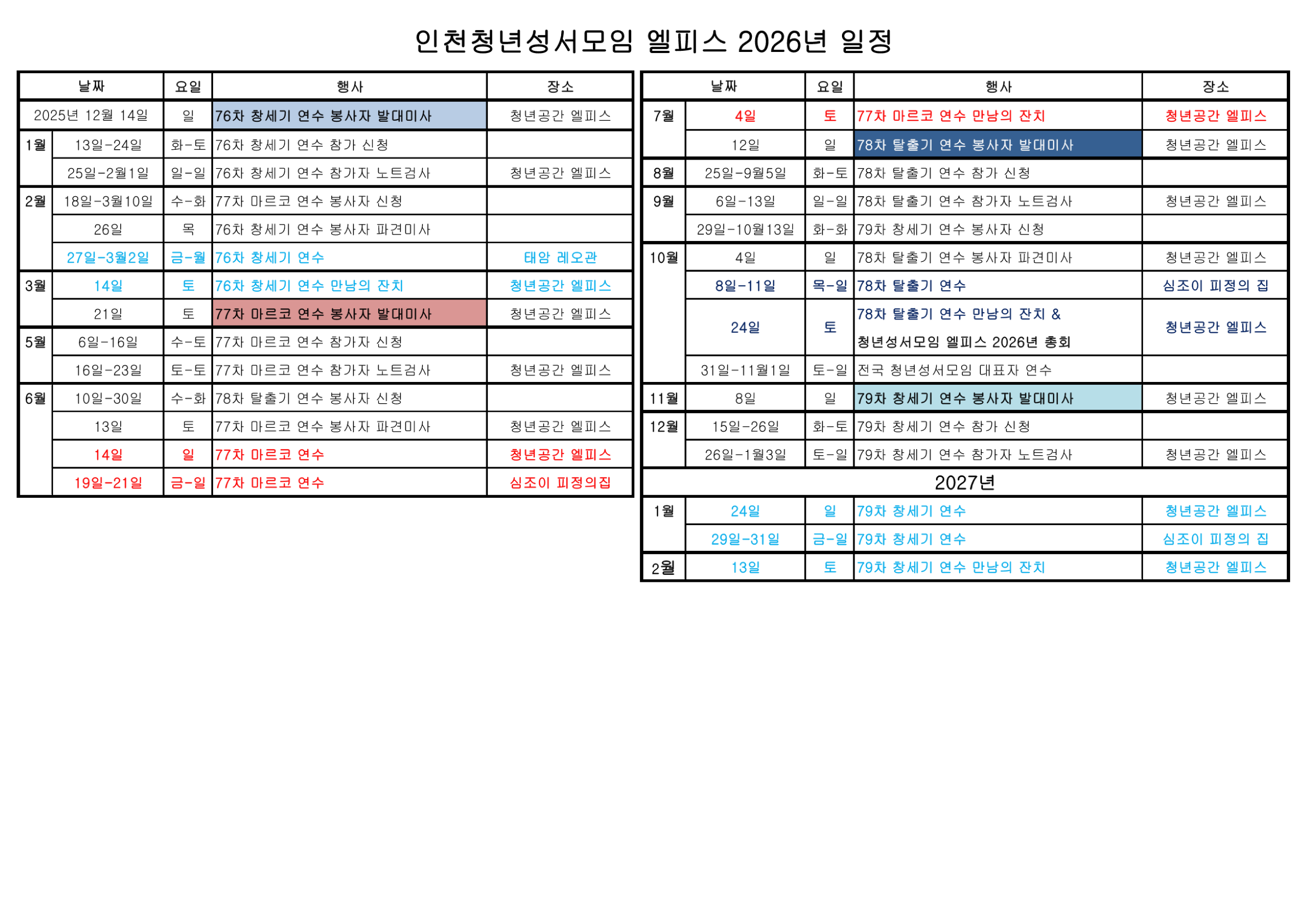 2026년 엘피스 일정 작성자이은정 카타리나|작성시간25.10.19|조회수157 목록 댓글 0 글자크기 작게가 글자크기 크게가 2026년 청년성서모임 엘피스 일정입니다. 제79차 창세기 연수는 2027년 1월 24일(일), 29~31일(금~일)에 진행할 예정입니다. 엘피스_2026년 일정_2511128.pdf47.29KB 첨부파일첨부된 파일이 2개 있습니다. png 파일 엘피스_2026년 일정_2511128.png_0001.png 다운로드 pdf 파일 엘피스_2026년 일정_2511128.pdf 다운로드 다음검색 현재 게시글 추가 기능 열기 북마크 공유하기 신고 센터로 신고 댓글 댓글 0 댓글쓰기 답글쓰기 댓글 리스트