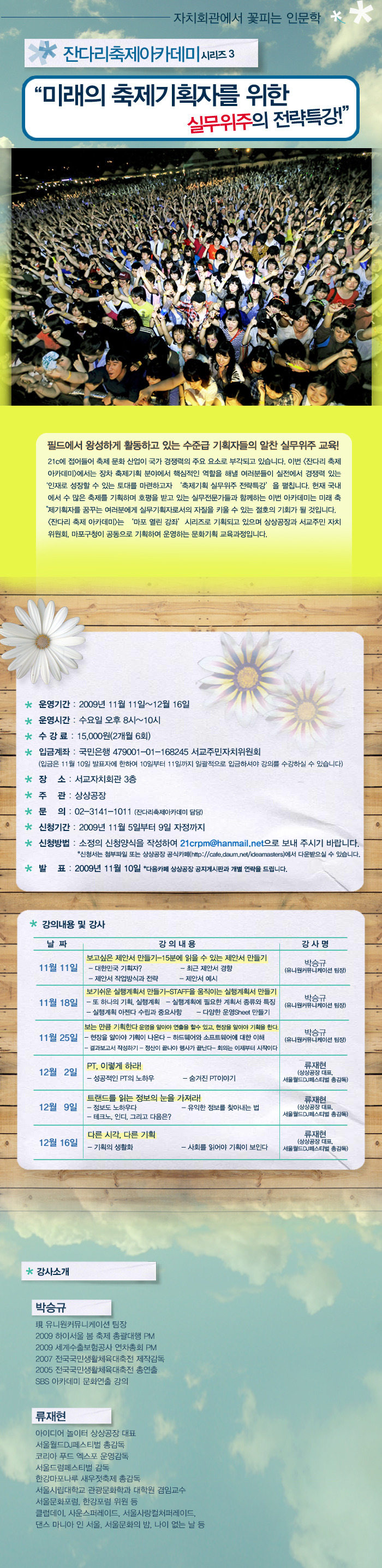 "미래의 축제기획자를 위한 실무위주의 전략특강!" 잔다리축제아카데미 3기를 모집합니다! 작성자최신우|작성시간09.11.06|조회수115 목록 댓글 0 글자크기 작게가 글자크기 크게가 잔다리축제아카데미_지원서.docx 잔다리축제아카데미_지원서.hwp 첨부파일첨부된 파일이 3개 있습니다. jpg 파일 잔다리축제아카데미.jpg 다운로드 docx 파일 잔다리축제아카데미_지원서.docx 다운로드 hwp 파일 잔다리축제아카데미_지원서.hwp 다운로드 다음검색 현재 게시글 추가 기능 열기 북마크 공유하기 신고 센터로 신고 댓글 댓글 0 댓글쓰기 답글쓰기 댓글 리스트