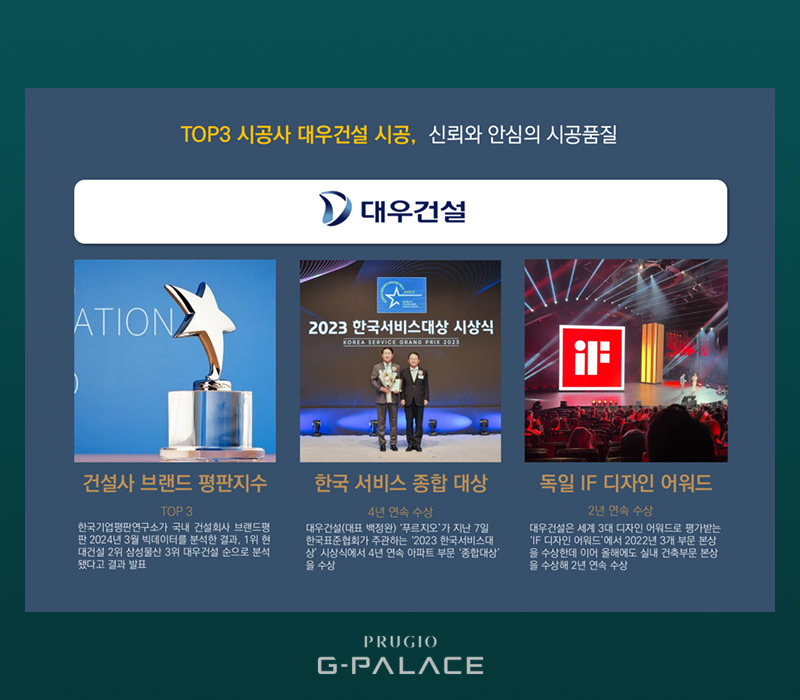 시공사는 국내에서도 상위 브랜드를 가진 대우건설이 맡았는데요. 이로 인해 사업성과 상품성에 대한 안정성과 신뢰도가 더해졌습니다. 한국표준협회에서 주관하는 서비스대상 4년 연속 수상했으며, 2024년 한국기업평판소 건설사 브랜드 평판지수 3위를 차지했습니다. 이러한 탄탄한 수상 내역과 그동안의 실적으로 통해 기술력과 축적된 노하우를 증명했기에 현장 역시 기대를 한몸에 받았습니다.