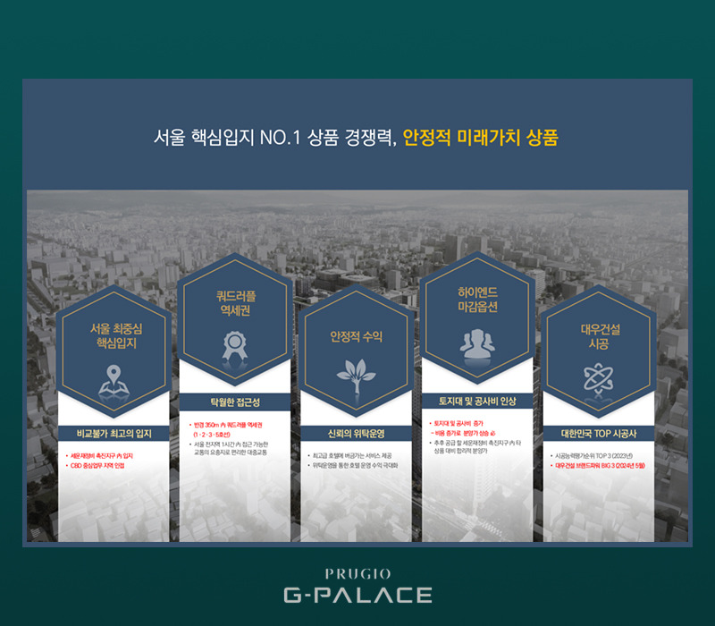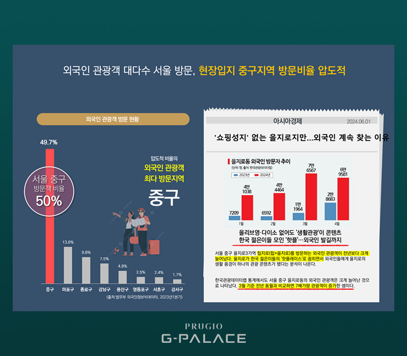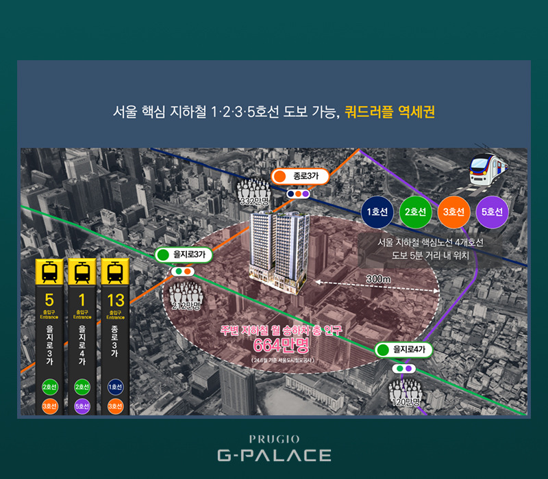 교통 편으로는 세운 푸르지오 지팰리스 단지를 기준으로 도보 5분 거리에 종로3가(1, 3, 5호선), 을지로3가(2, 3호선), 을지로4가(2, 5호선) 등 서울 지하철 핵심 노선인 4개 호선을 이용할 수 있는데, 월 승하차 총 인구만 665만명에 달한다고 전했습니다. 즉, 전반적으로 배후 수요는 물론 풍부한 유동인구까지 확보했죠.