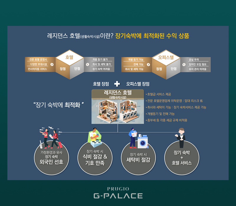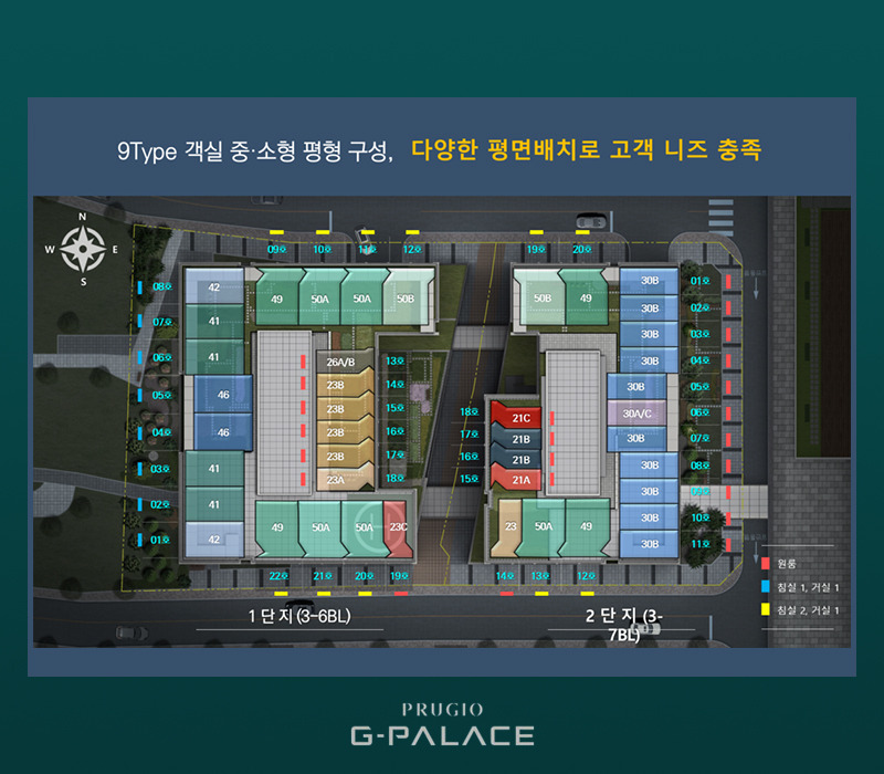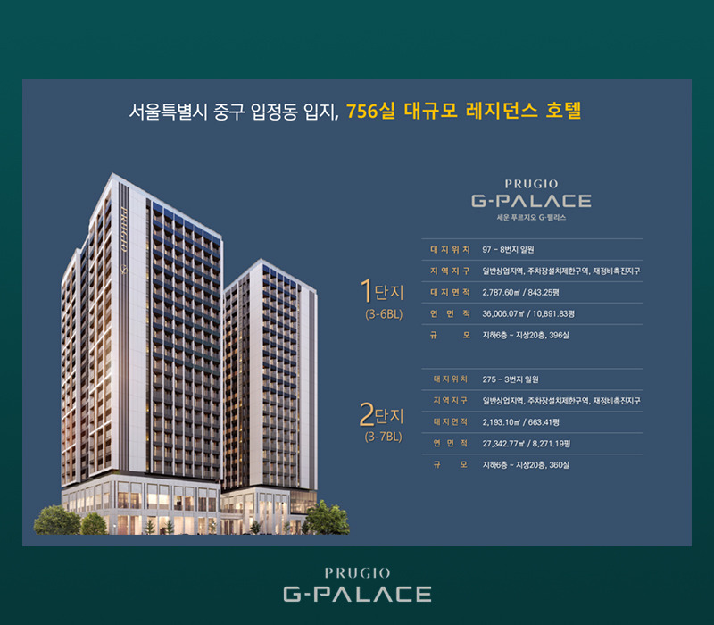 서울 중구 입정동 일원에 들어설 세운 푸르지오 지팰리스 현장은 1단지(지하 6층~지상 20층 396실), 2단지(지하 6층~지상 20층, 360실)로 구성되었습니다. 총 756실 규모를 가진 대규모 레지던스 호텔로 내부는 9개 타입의 중소형 위주로 설계했고, 다양한 평면배치를 통해 고객의 니즈를 충족했죠.