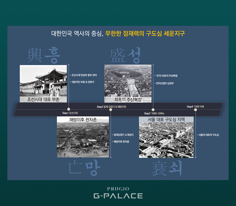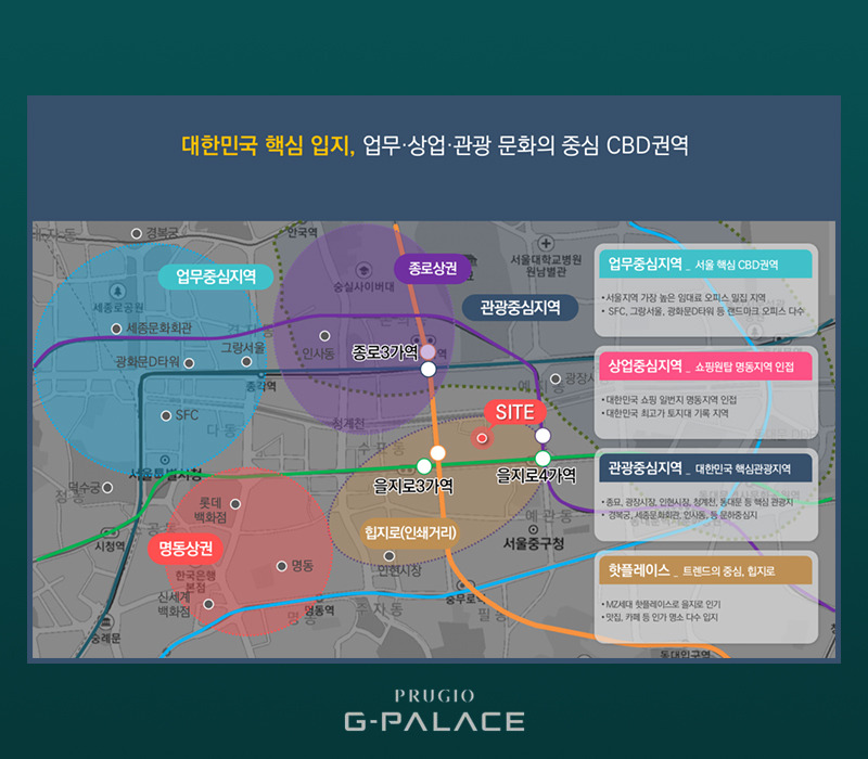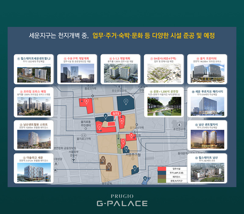 세운 푸르지오 지팰리스 사업지는 대한민국 역사의 중심이면서 무한한 잠재력의 구도심으로 여겨지는 세운지구 내에 최중심 입지를 선점했습니다. 조선시대부터 대표적인 부촌으로 손꼽혔다고 하는데, 그동안 대표적인 구도심 지역이었습니다. 현재 노후화된 건물을 재개발하여 천지개벽으로 탈바꿈하는 중으로 다양한 업무, 숙박, 문화 등의 시설들이 준공되었거나 준비하고 있어 미래가치가 풍부합니다.