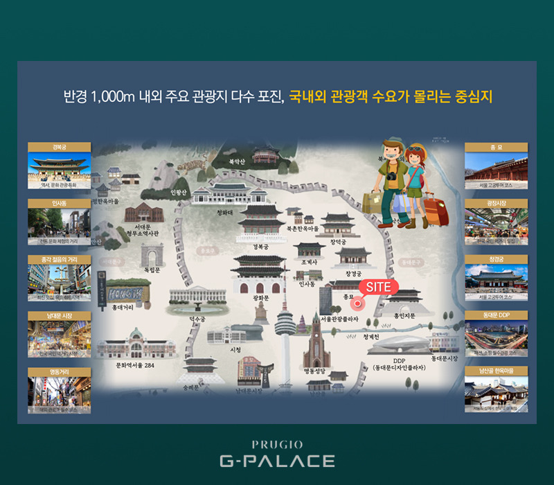 이와 함께 반경 1km 이내 거리에는 경복궁, 인사동, 종각 젊음의 거리, 남대문 시장, 명동, 종묘, 광장시장, 창경궁, 동대문 DDP, 남산골 한옥마을 등으로 국내외 관광객 수요가 몰리고 쇼핑의 메카인 명동과도 인접하여 여가를 즐기기에도 용이합니다.