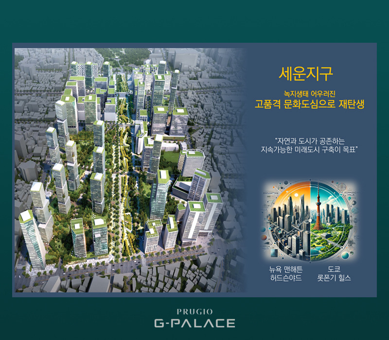 재개발 완료 시 뉴욕 맨하튼 허드슨 야드 혹은 도쿄 롯폰기 힐스와 같이 자연과 도시가 공존하는 모습으로의 변화를 시사했는데요. 단순히 건물만 지어지는 것이 아니라 자연의 푸르름을 느낄 수 있도록 녹지 생태가 어우러진 고품격 문화 도심으로 재탄생할 예정이기에 더욱 돋보입니다.