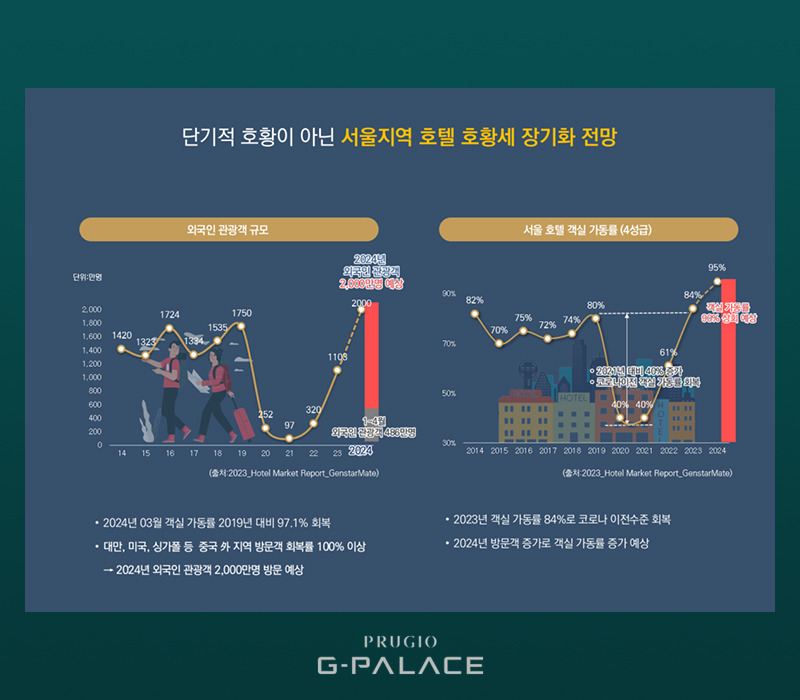 지난 코로나 이후 주춤했던 서울을 방문하는 외국인 관광객이 다시 급증했습니다. 그렇기에 지역 내 호텔이 역대급 호황기를 맞이한 모습을 볼 수 있는데요. 지난해 서울 객실 가동률(4성급)이 84%로 코로나 이전 수준을 회복했고, 올해는 꾸준한 방문객 증가로 인해 가동률이 더욱 증가하였습니다.