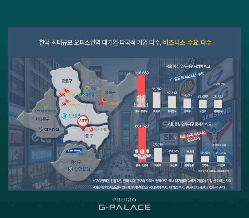 앞에서도 언급했지만, 세운지구는 핵심 입지로 업무와 상업, 관광, 문화 중심지와도 가까워 인프라가 잘 발달되었습니다. 하나씩 보면 높은 월세를 보여주는 CBD권역과 인접했는데, 이 곳에는 SFC, 광화문 D타워 같은 랜드마크 오피스가 다수 위치했죠. 무엇보다 전통적인 대단위 규모의 오피스 권역인 만큼 압도적인 비즈니스 수요를 품었고, 국내 대기업 및 다국적 기업이 선호하는 지역이기에 가깝게 자리 잡은 현장을 향한 수혜를 기대합니다.