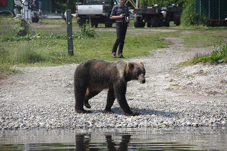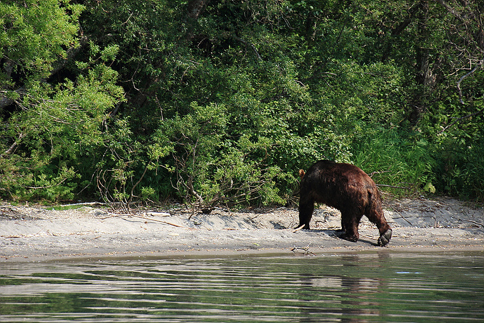 보트를 타고 출발하는데 곰한마리가 방금 지나온 선착장 앞에 나타났다....