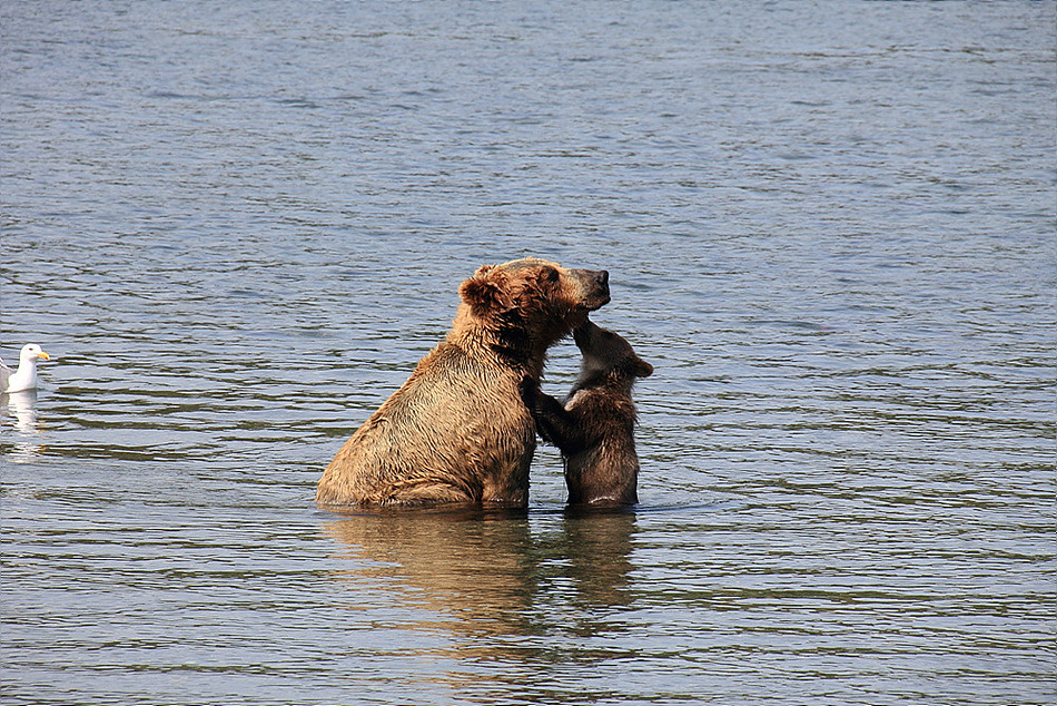 연어를 잡아먹은 어미한테 연어 어디있냐고 새끼곰이 보챈다....