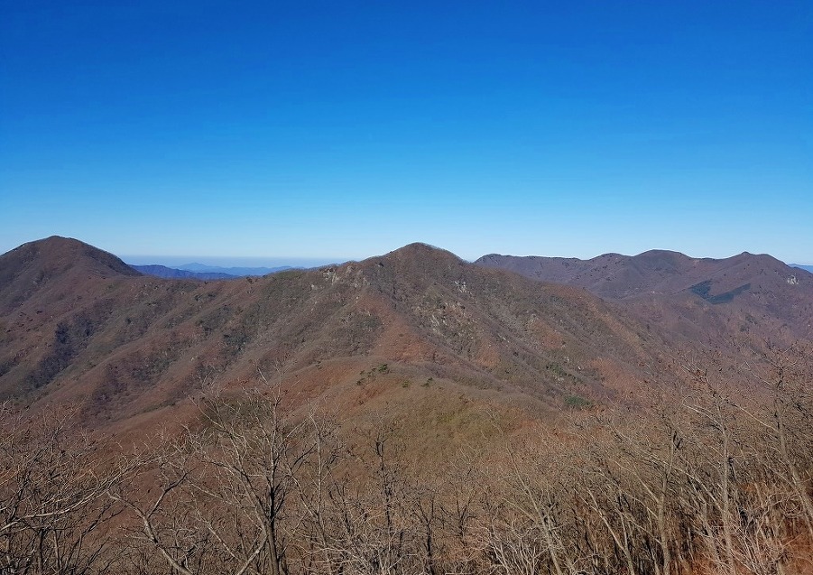 가운데는 정맥길의 삿갓봉과 멀리 정맥길 특징없는 1034봉에서 벗어난 덕태산도 보이고