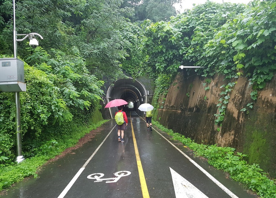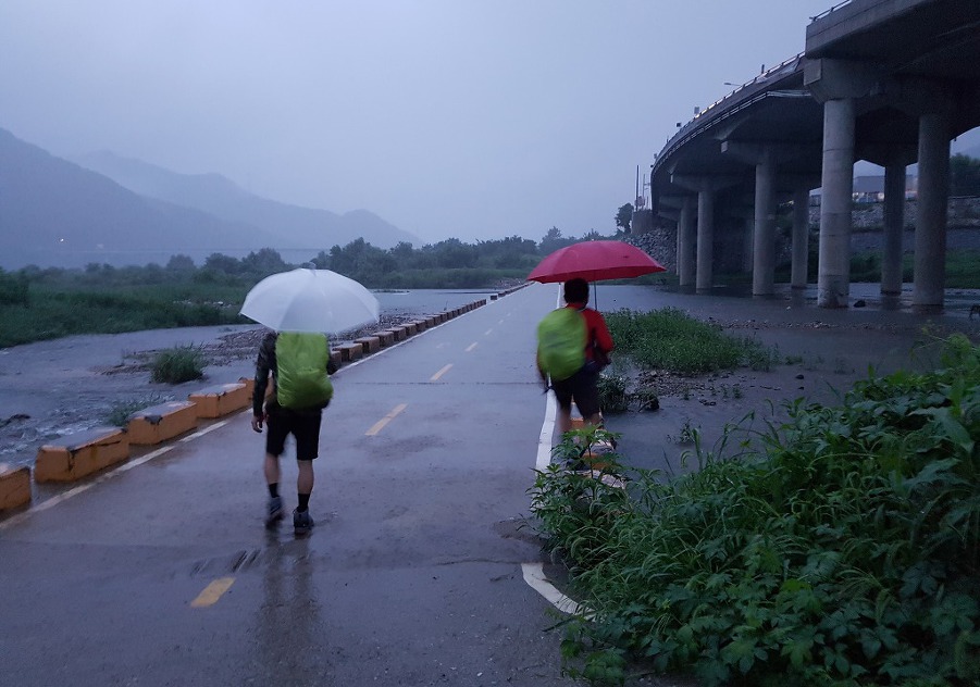 가끔 떨어지는 빗방울에 배낭 커버를 덮었다가 벗길 반복하며