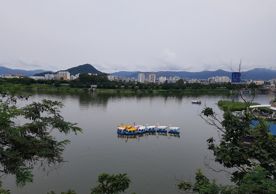 강위로 모터 보트에 강습받는 사람들과 물보라 구경하며 지나니 춘천 대첩비가 자리하는 평화공원이다.