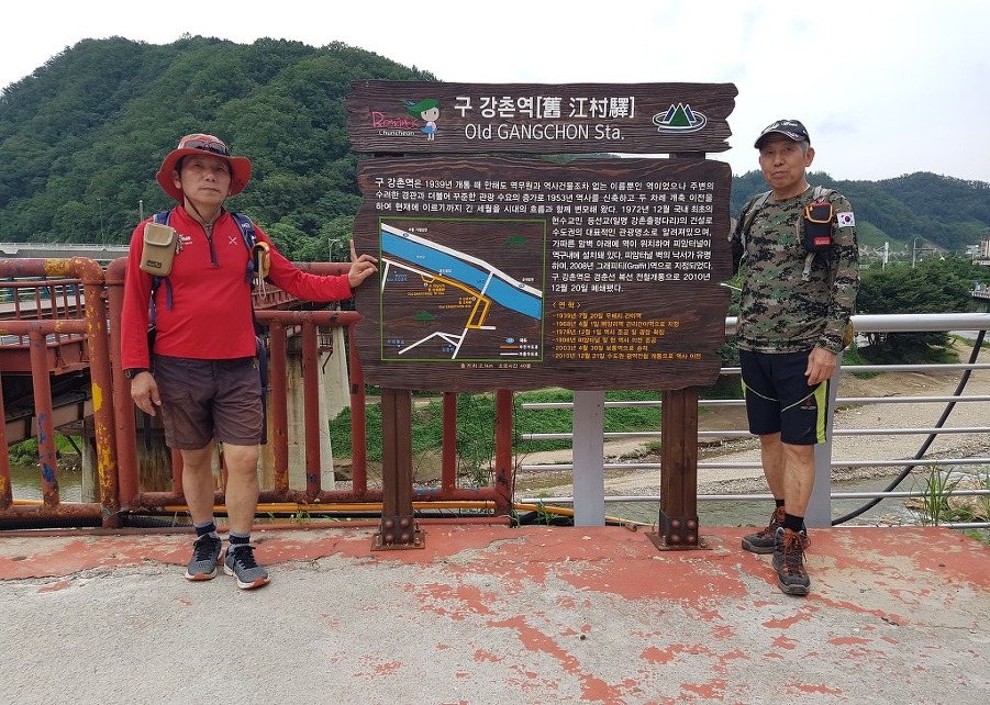 강촌다리 건너와 구강촌역 안내판을 배경으로
