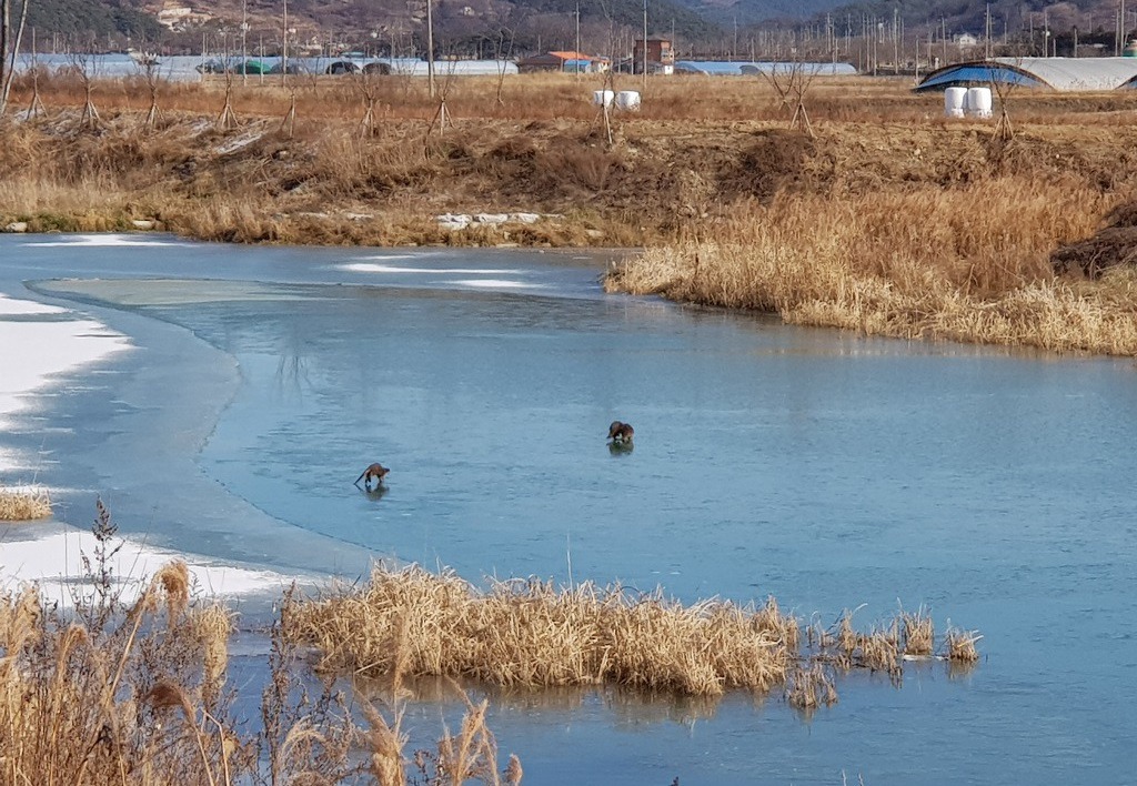 가다보니 수달 가족 3마리가 얼음 위를 어슬렁 어슬렁 지나는데
