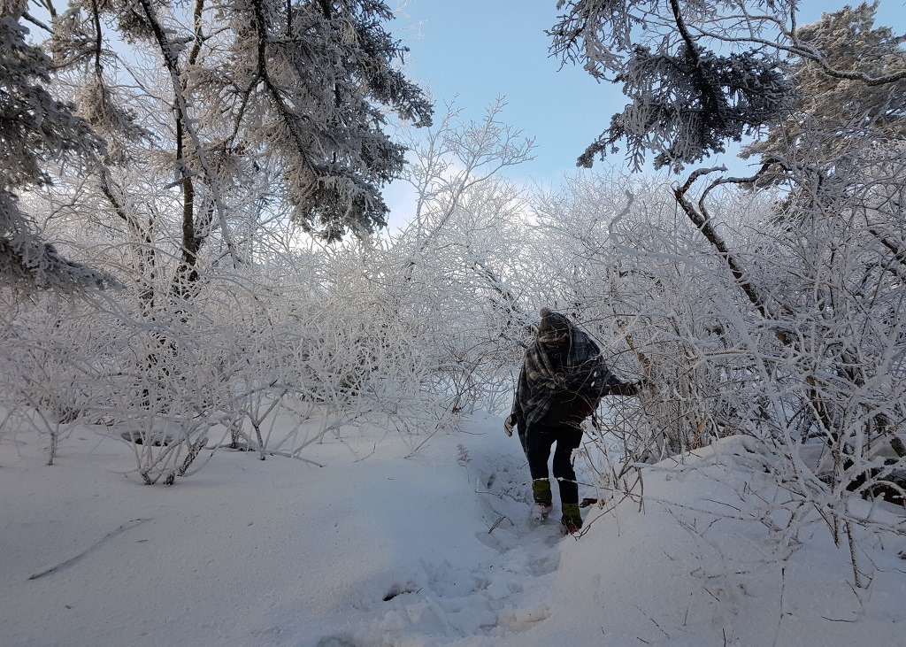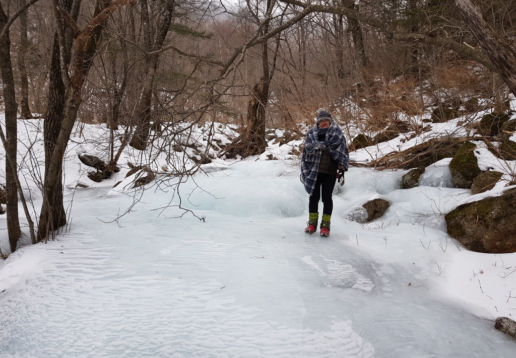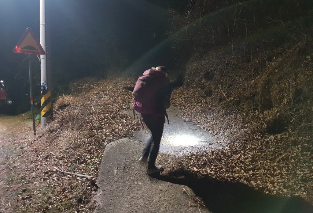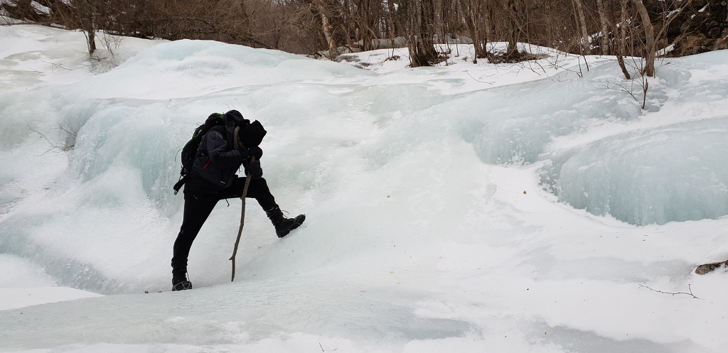 눈길에 힘을 못쓰는 깽이님 아이젠만 착용해 드리고