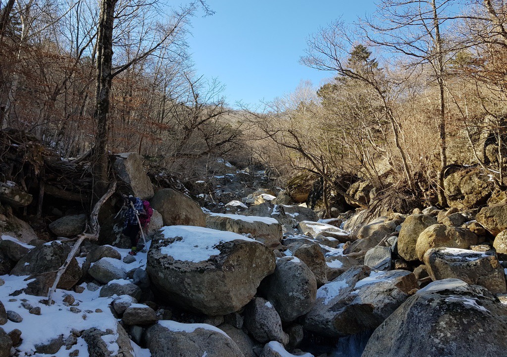 너덜 바위로 눈이 내려 진행이 어렵고 한참 내려오니 좀 살것 같다.