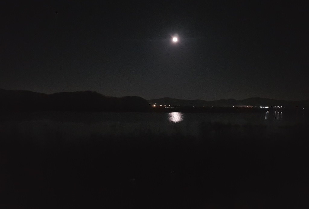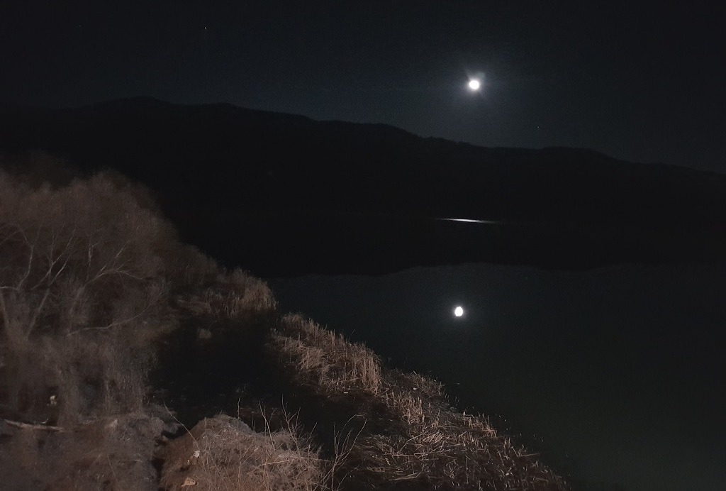 드디어 남강댐에 들어와 달빛이 물에 그윽하게 잠긴 모습을 보며 짧았던 덕천강은 이것으로 끝나게 되니