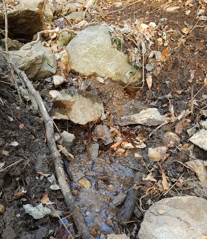 정맥 마루금에서 50여미터 내려오니 조그만 돌 아래로 물이 흘러 나온다.