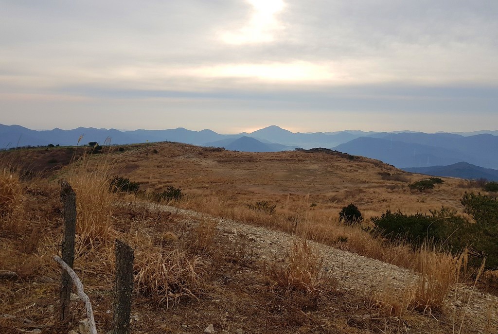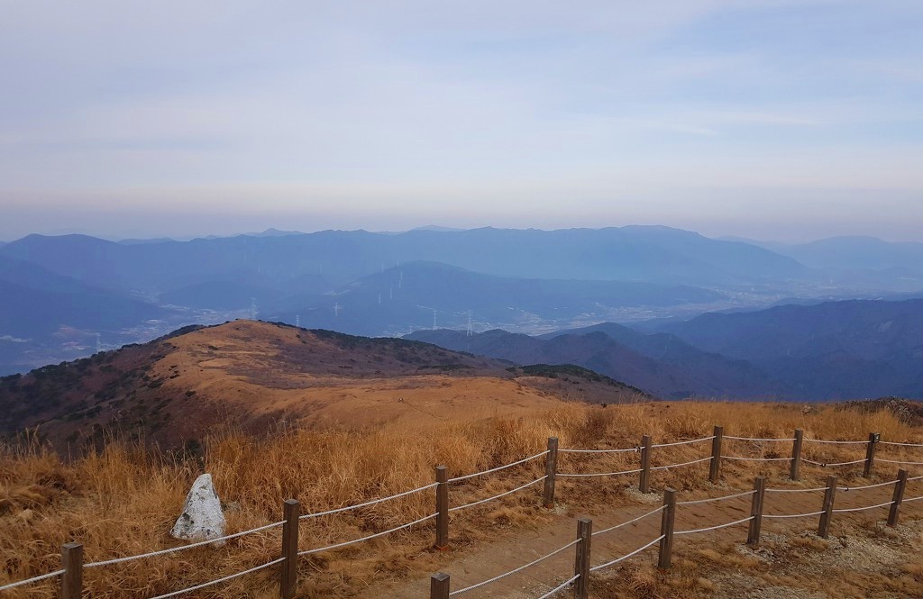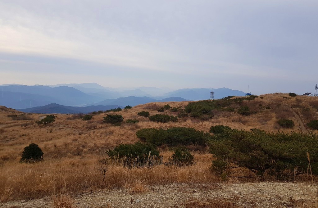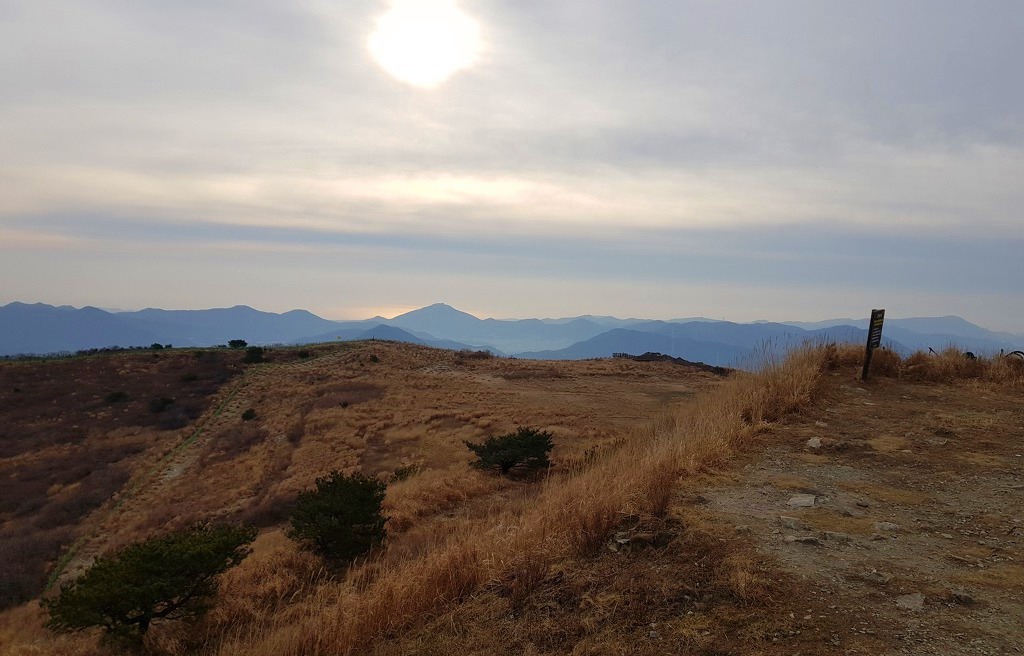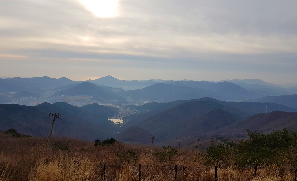 산넘어 낙동강이 흐르고 김해의 무척산이 보인다.