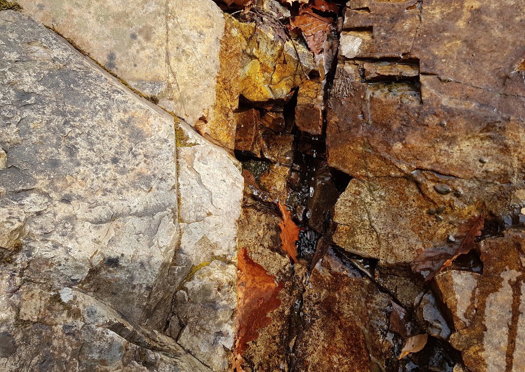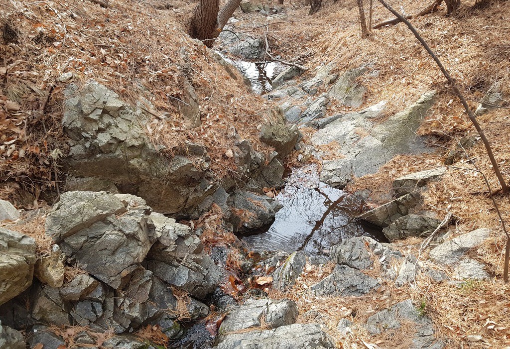 바위와 돌 틈으로 다시 나타난 물이 흘러가는곳