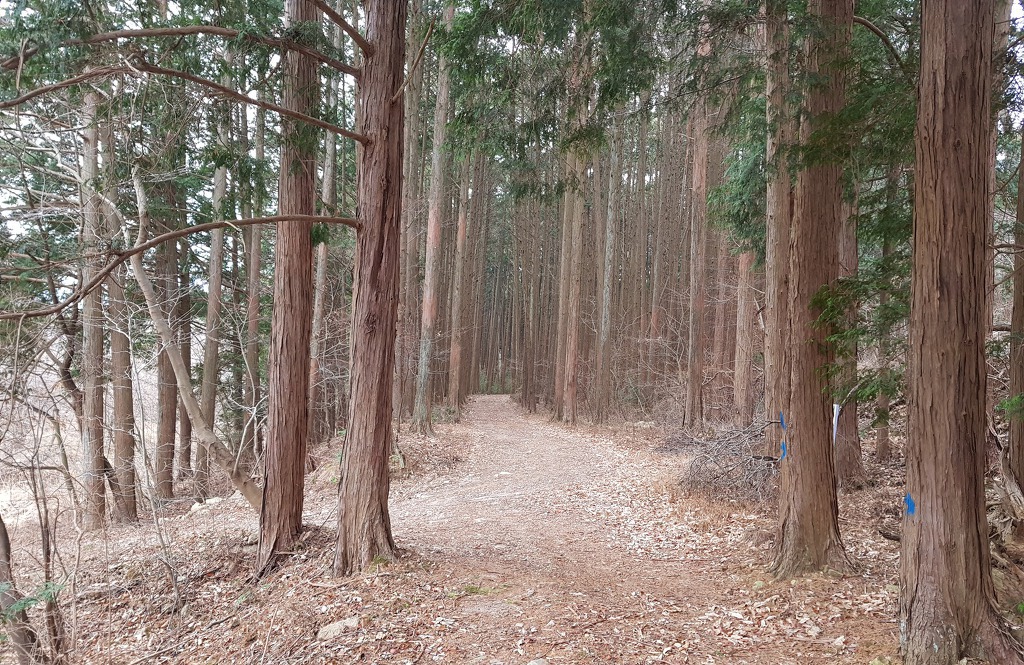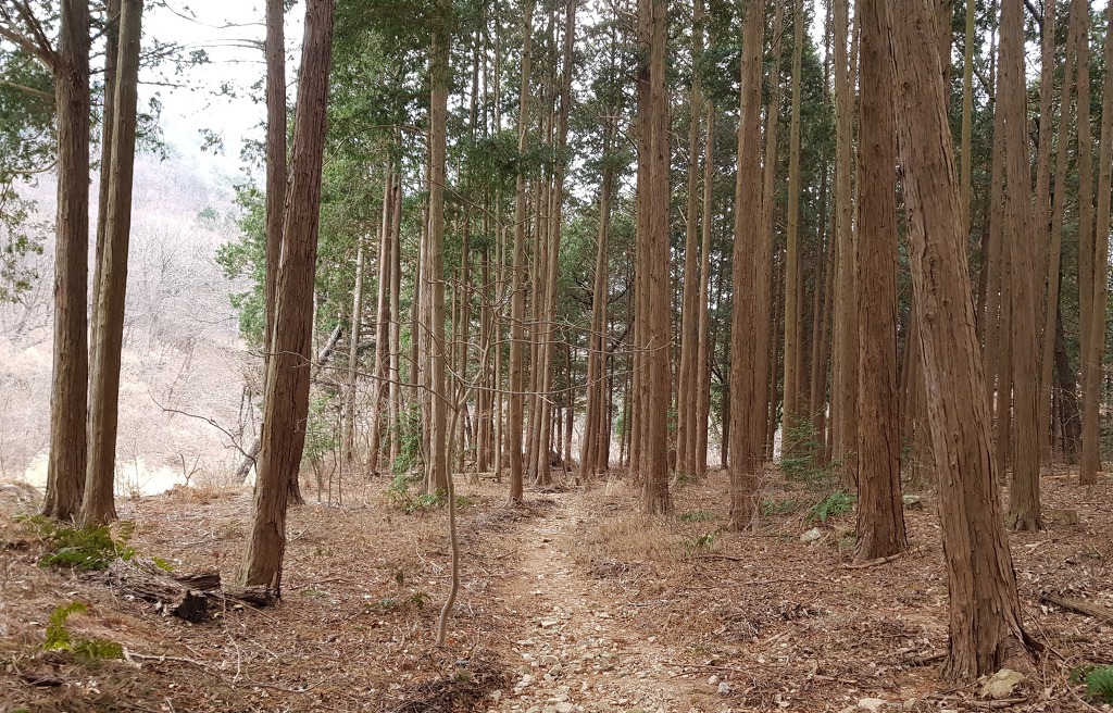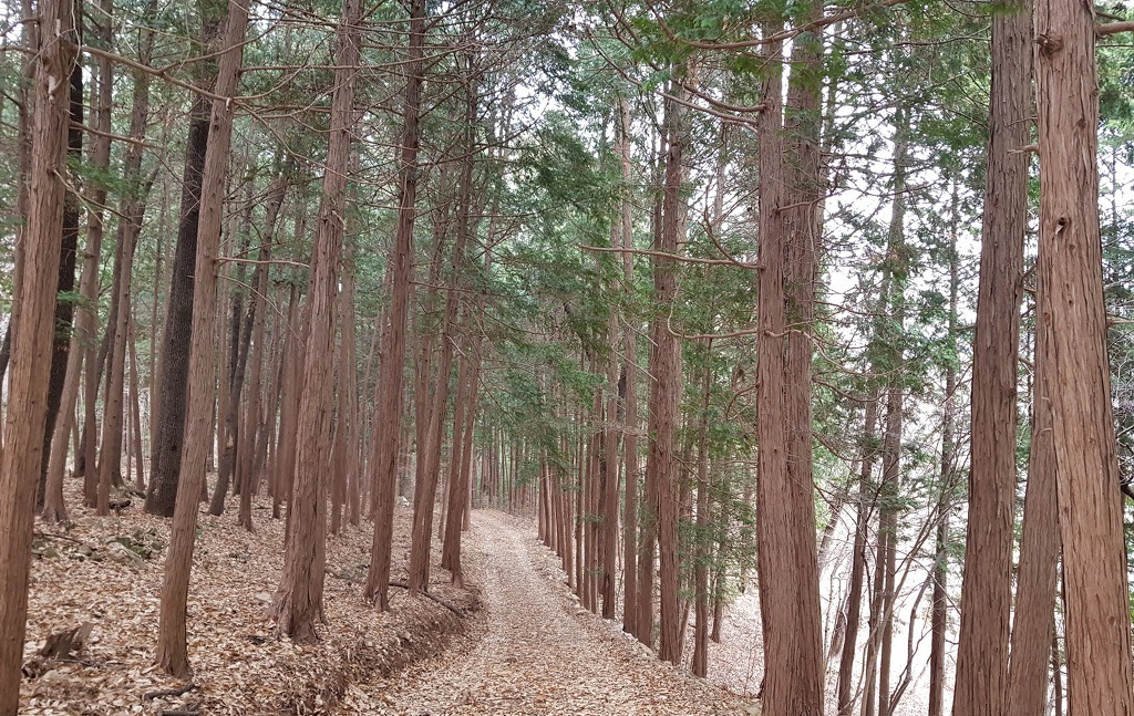 이곳부터 법기수원지까지 굵은 편백나무가 줄지어 나타난다.