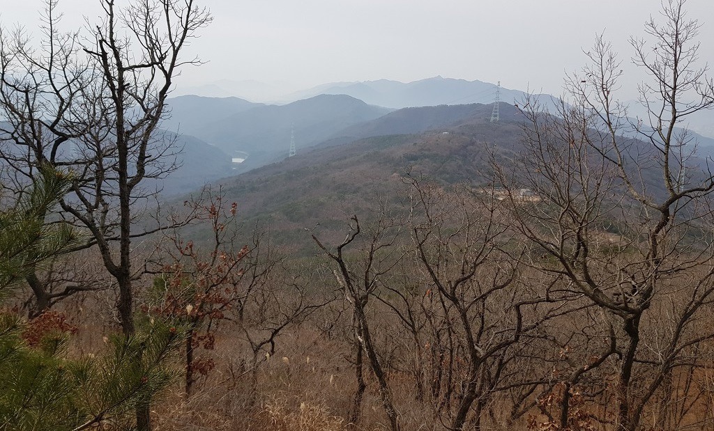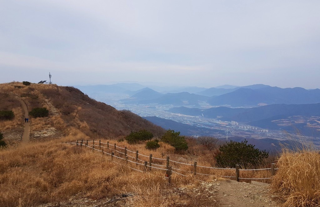 천성 2봉과 낙동정맥길 그리고 우측으로 대운산이 보이고 저 넘어로 울산 울주군 온산 국가 산업 단지가 있는곳이겠다.