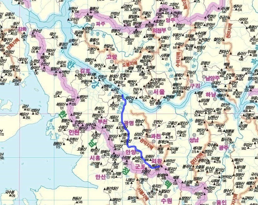 이고,안양천은 이곳 백운산 정상 군부대 있는 서쪽 계곡에서 발원해 의왕시-안양시-서울 금천구-양천구-영등포구-영창교