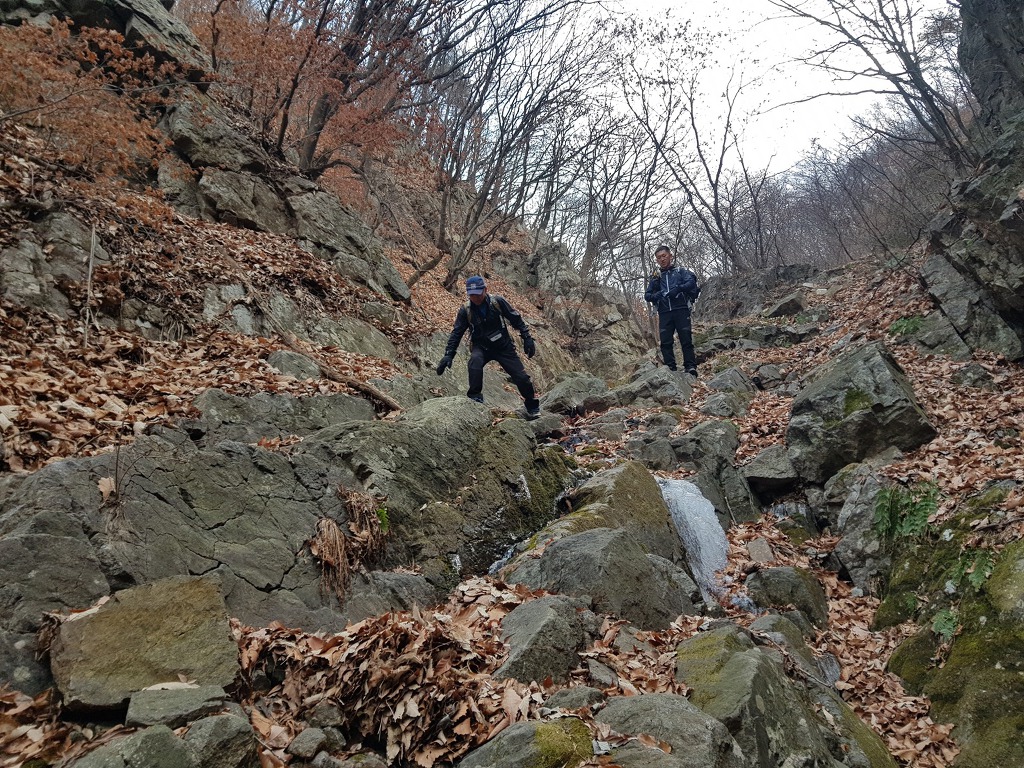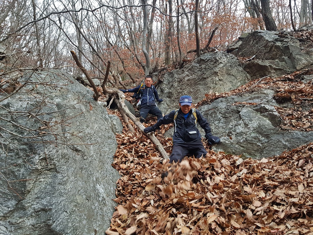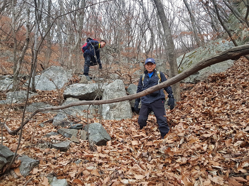 정상에서 기다리다 산 아래까지 다시 내려와 마중오신 수도권 산행 대장님이신 밤도깨비님을 만나 함께 움직인다.