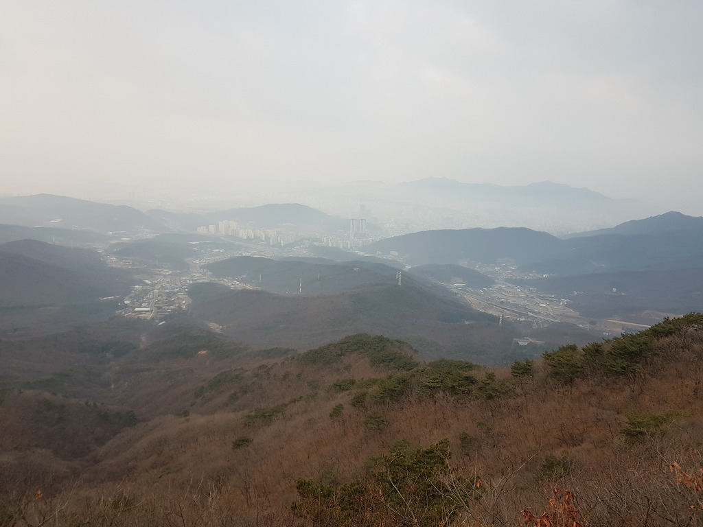 이어지게 된다.뿌연 박무속으로 보이는 도심은 의왕시 모습이다. 좌측 산줄기따라 조금만 더가면 한남정맥길의 지지대 고개