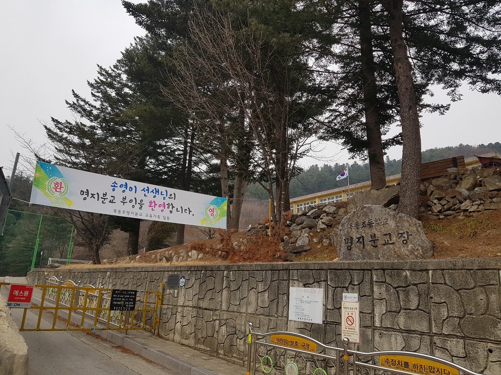 송영미 선생님 환영한다는 현수막이 두팔 벌려 환영하나