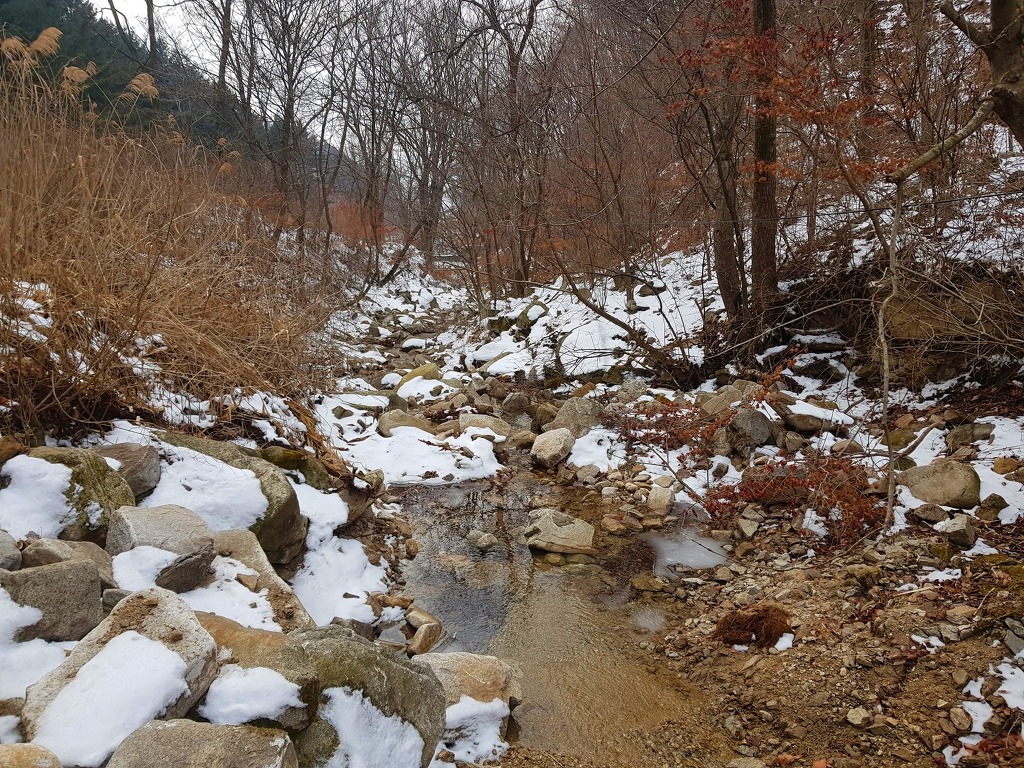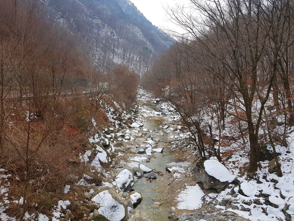 눈이 온건지 비가 온건지 질퍽한 산길로 오르면 되지만 등산화가 아니고 운동화를 신고와서 몇시간 동안 질퍽한 신발 신고 강따라 내려가야 할듯하다.